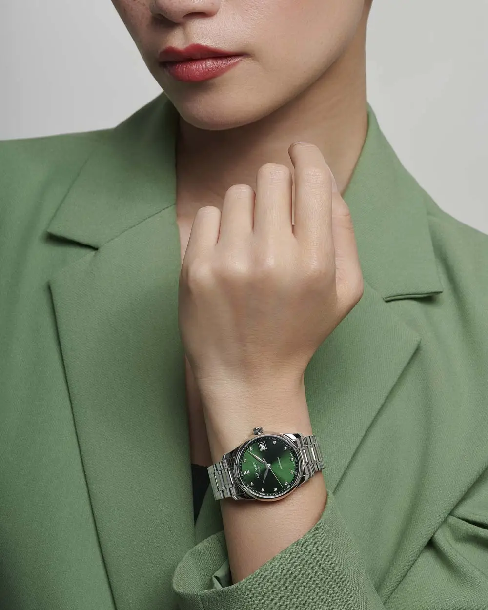 The attractive green analog dial adorned with diamond indexes gives the watch a luxurious touch and is complemented by a practical date window at 3 o’clock.