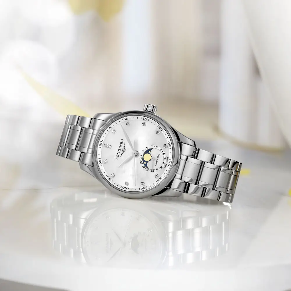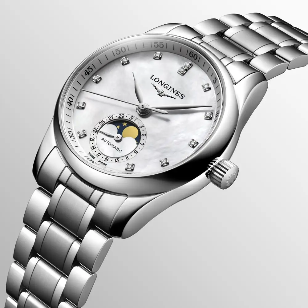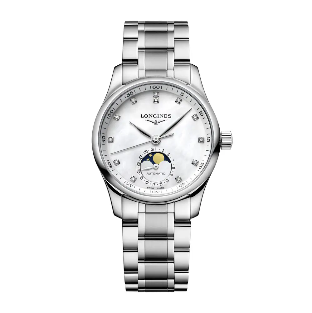 The white mother-of-pearl dial is adorned with 12 diamond indexes (~0.055 ct) and elegant silver-tone hands, creating a luxurious look. At 6 o’clock, a subdial displays the moonphase and date, adding sophistication and uniqueness.