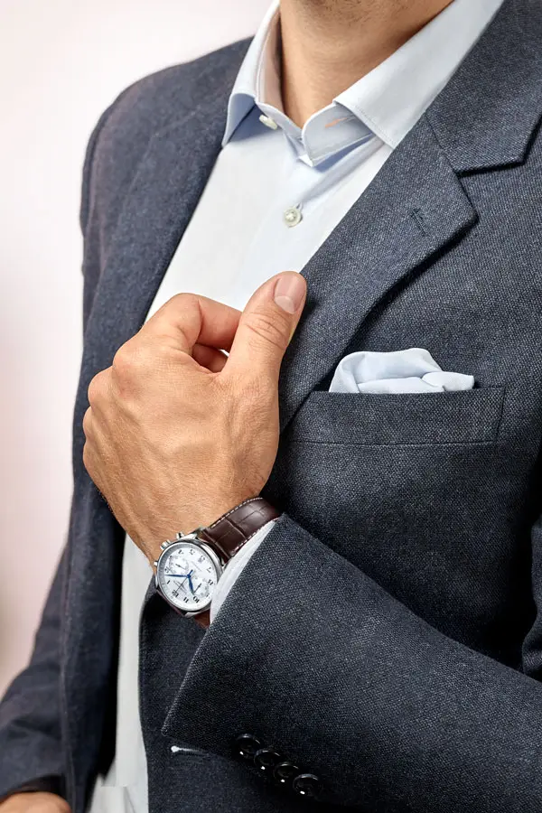 On the silver “barleycorn” dial, blued steel hands, Arabic numerals, and chronograph subdials stand out. A date window at 6 o’clock ensures balance, while the chronograph function adds a sporty-elegant character.