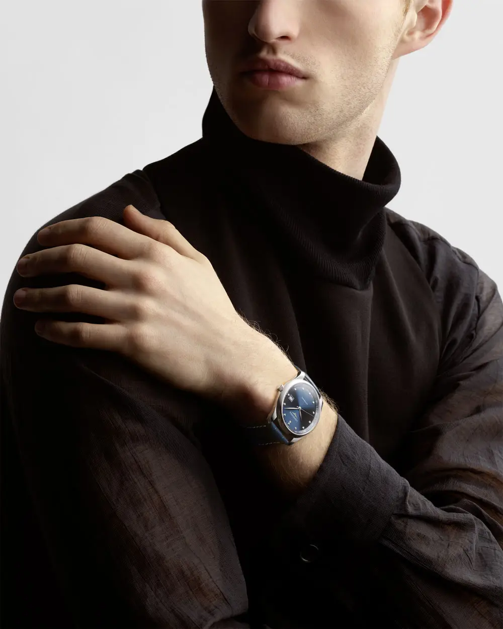 The classic watches are presented by THE LONGINES MASTER COLLECTION in masterful craftsmanship and a combination of luxury materials. The dark blue underlines the perfect elegance and timelessness of this model. It is repeated in the colour of the alligator-patterned leather strap and the dial. Small diamonds set in the base shine from the base. The circumference of the dial is divided into individual hourly sections. A date marker completes the precise time. A mechanical movement with automatic winding controls the reliable operation.