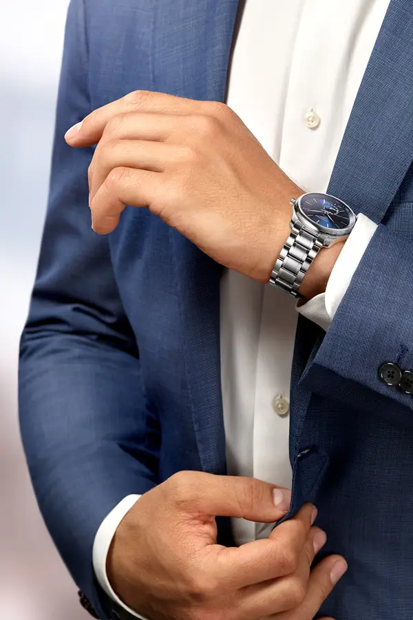On the blue sunray dial, applied indexes and silver-tone hands stand out, complemented by a subdial at 6 o’clock that combines the moonphase display with a date function. This detail enhances both practicality and visual charm.