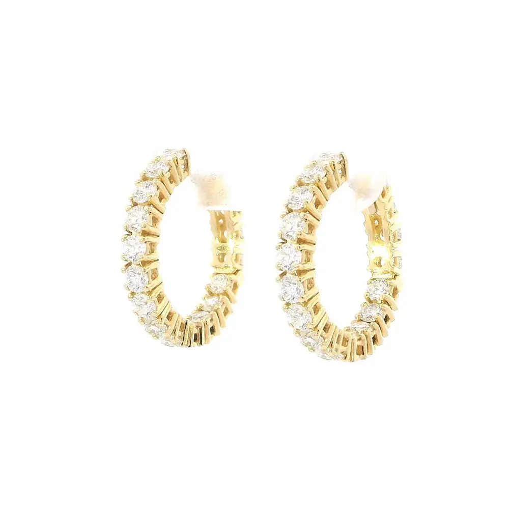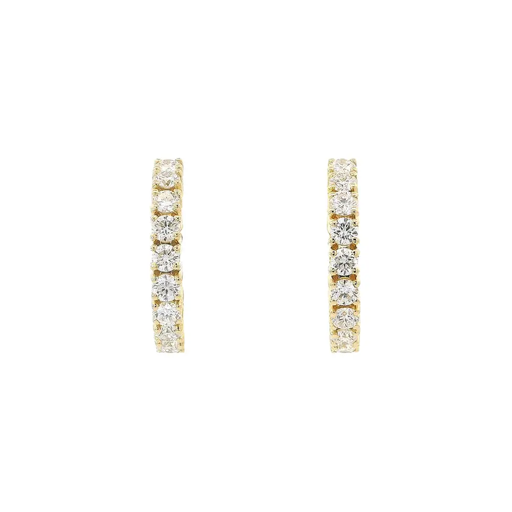 These beautiful round earrings are made of 18kt yellow gold and decorated with 26 natural diamonds weighing a total of 2.30 ct. The G color and VS clarity diamonds provide amazing sparkle and brilliance that will accentuate any outfit.