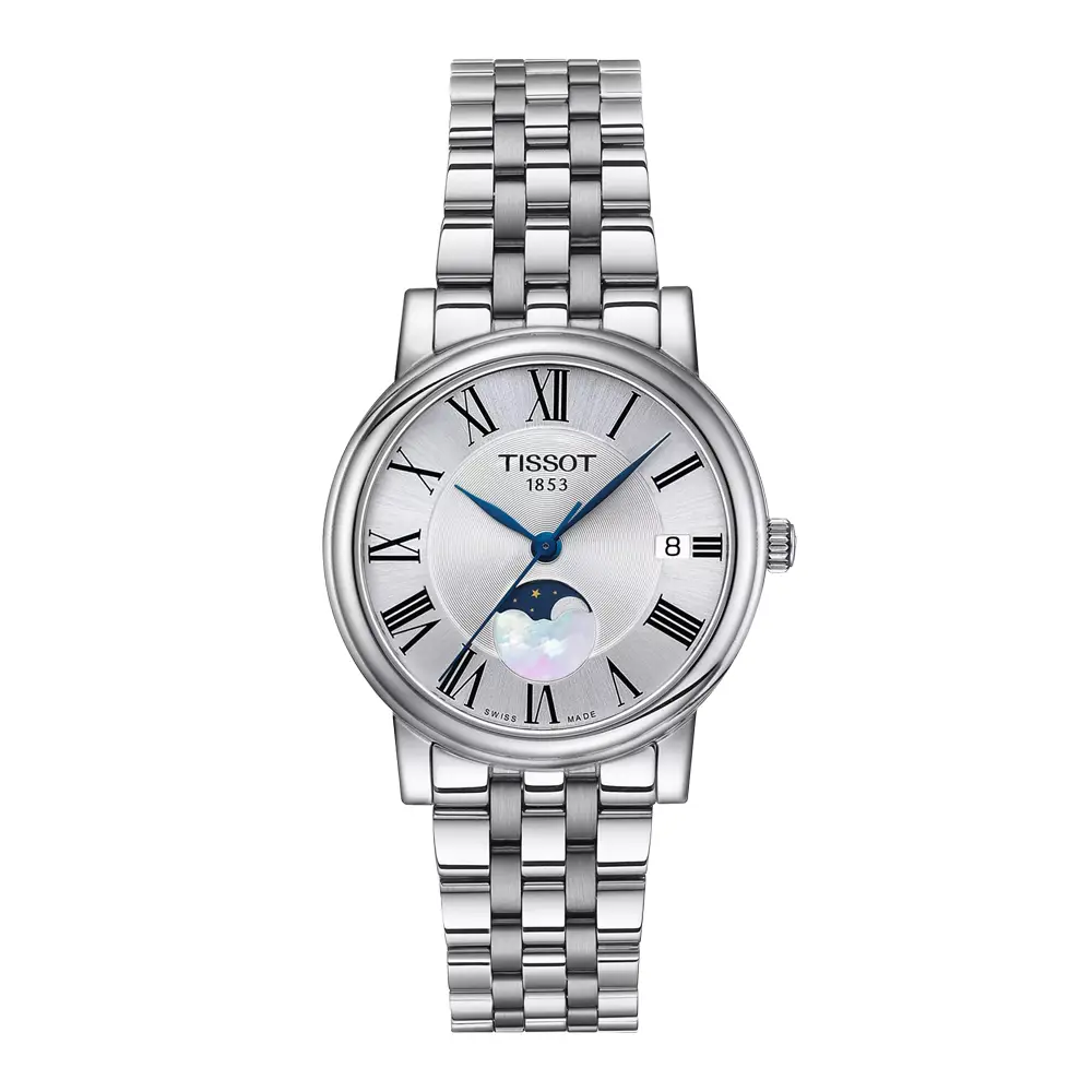The Tissot Carson Premium Lady Moonphase blends delicate aesthetics, timeless elegance and Swiss precision, making it a refined companion for everyday wear as well as special occasions. Its 32 mm 316L stainless-steel case frames a balanced silver dial with Roman numerals and blued hands, offering a classic and harmonious look. The stainless-steel bracelet completes the watch with a polished and feminine touch.
