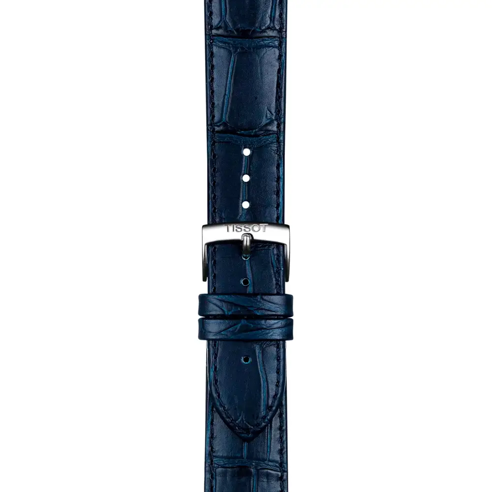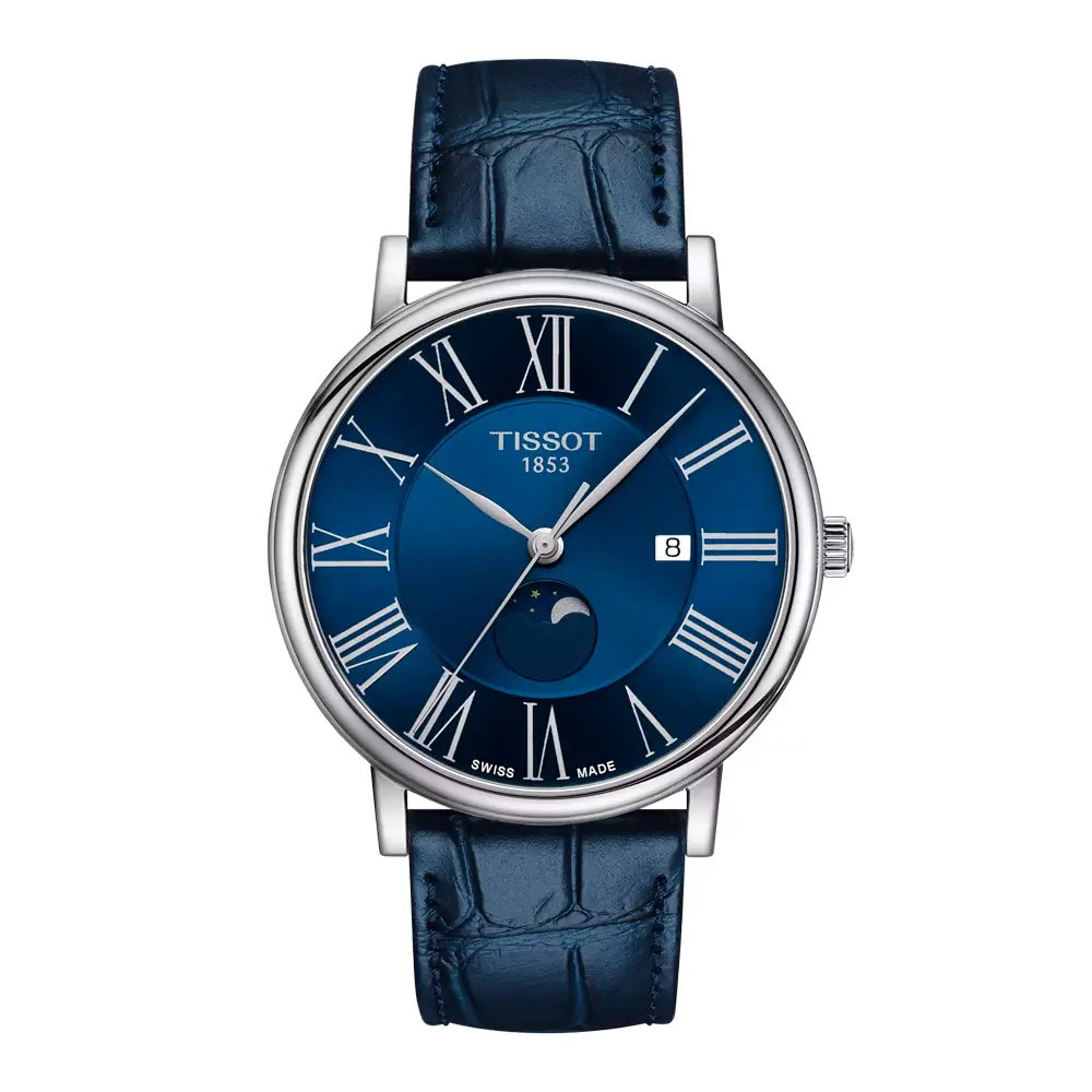 The Tissot Carson Premium Moonphase blends timeless elegance with refined watchmaking craftsmanship. Its 40 mm stainless steel 316L case is polished to perfection and paired with a deep blue dial featuring Roman numerals and a sophisticated moon phase display at 6 o’clock, adding both romance and technical charm.