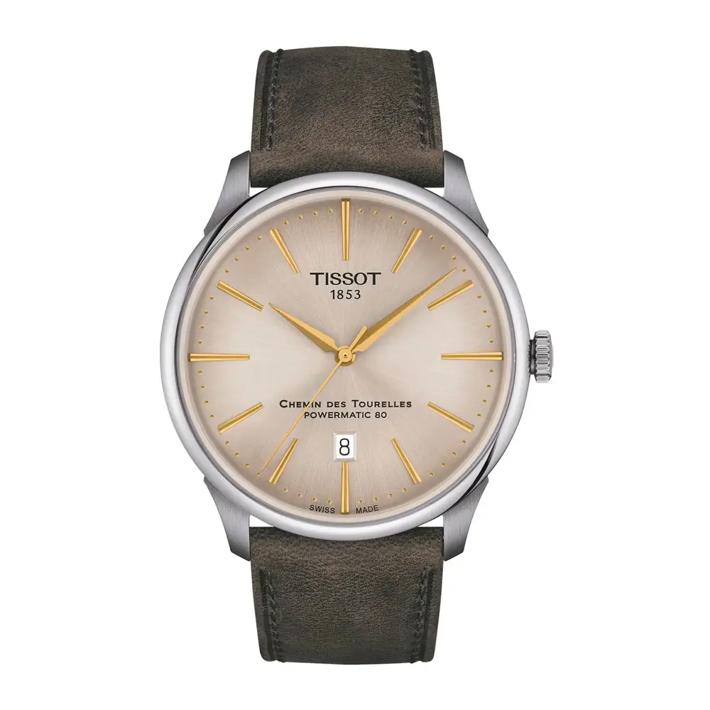 The Tissot Chemin des Tourelles Powermatic 80 T139.407.16.261.00 pays tribute to Tissot’s Swiss heritage and its origins in Le Locle. Its elegant 42mm stainless steel case is complemented by a beige-cream textured dial with polished indexes, giving the watch a refined and timeless appearance.