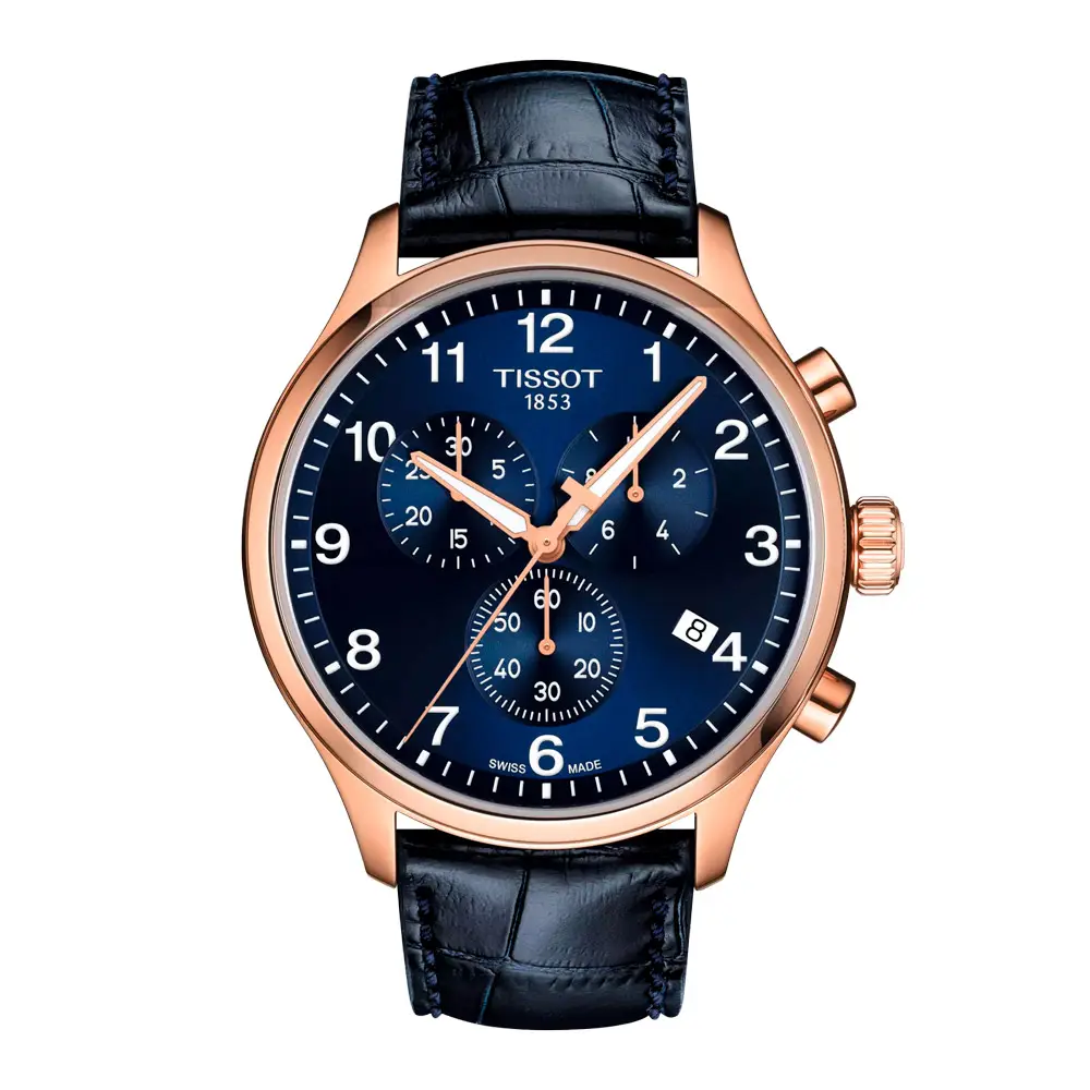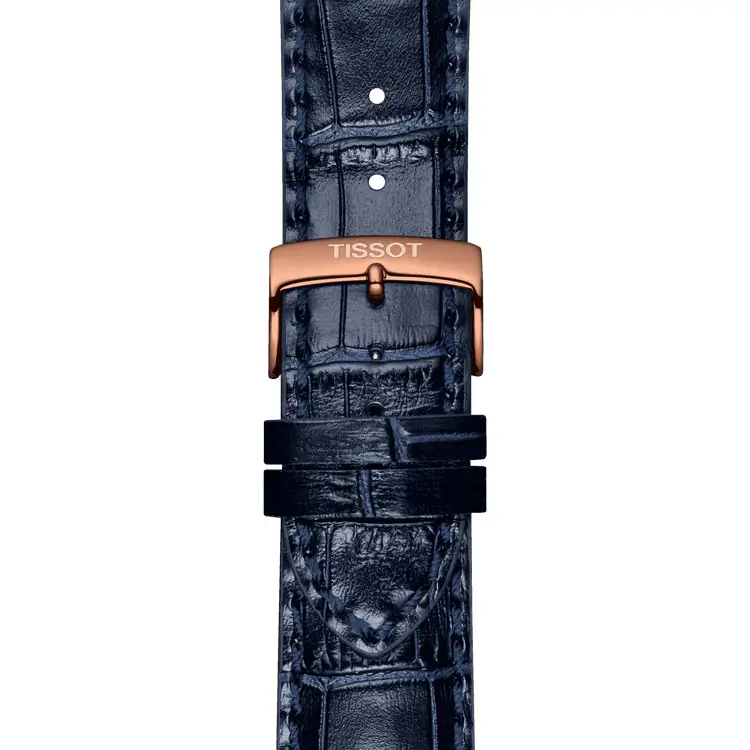 The blue leather strap with an alligator-style texture is secured by a pin buckle engraved with the Tissot logo, ensuring a comfortable and secure fit.
