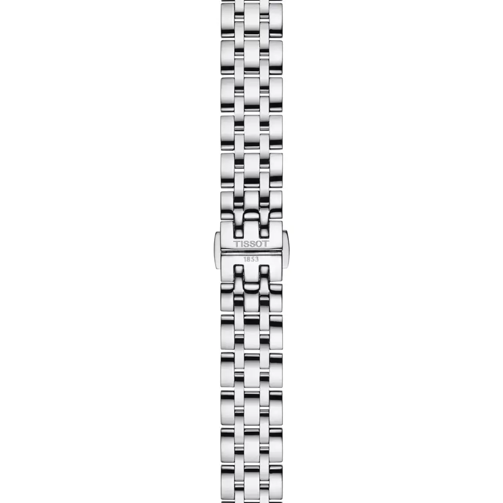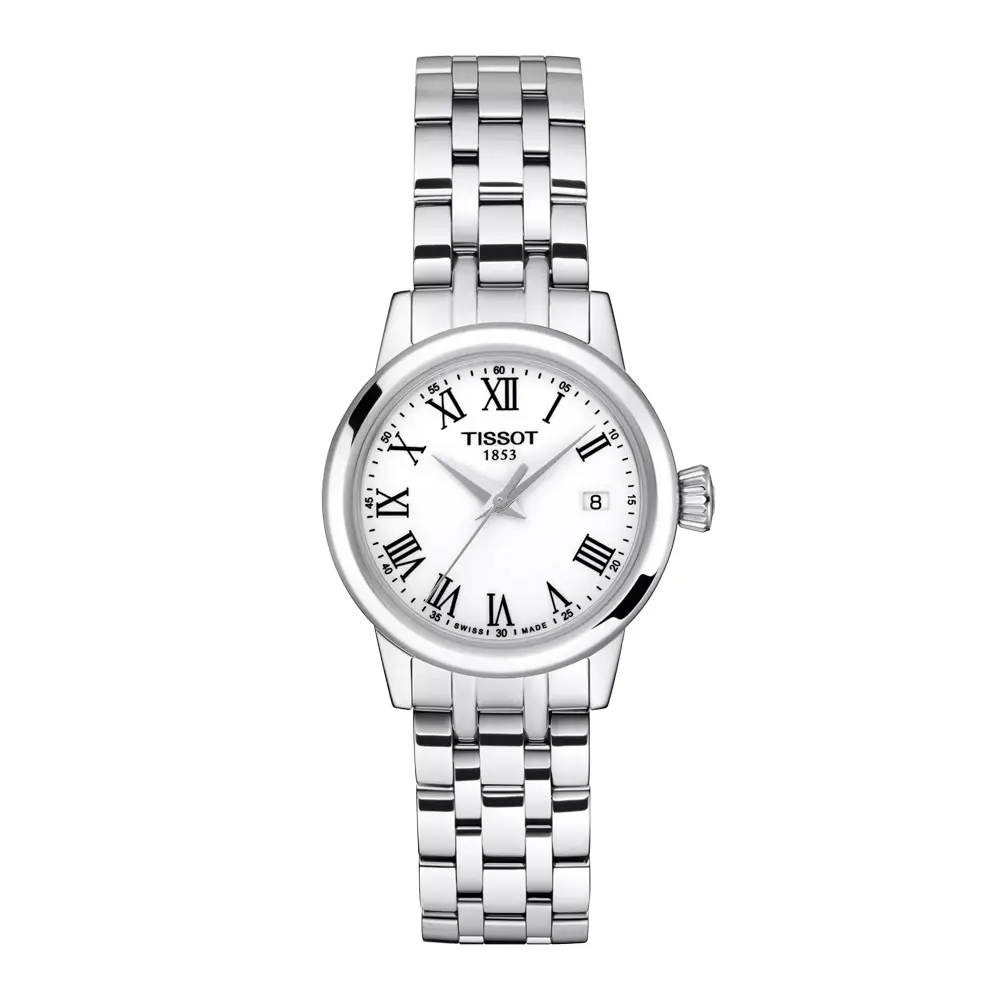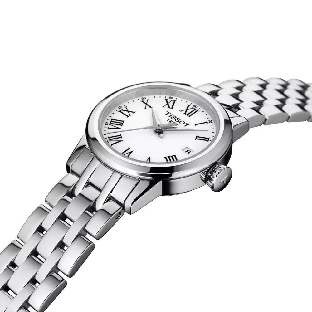 The Tissot Classic Dream Lady blends timeless elegance with refined feminine style, making it a perfect accessory for both everyday wear and formal occasions. Its compact 28 mm 316L stainless-steel case is paired with a clean white dial featuring Roman numerals, creating a classic, sophisticated appearance. The look is completed by a polished stainless-steel bracelet with a butterfly clasp, ensuring comfort and secure wear.