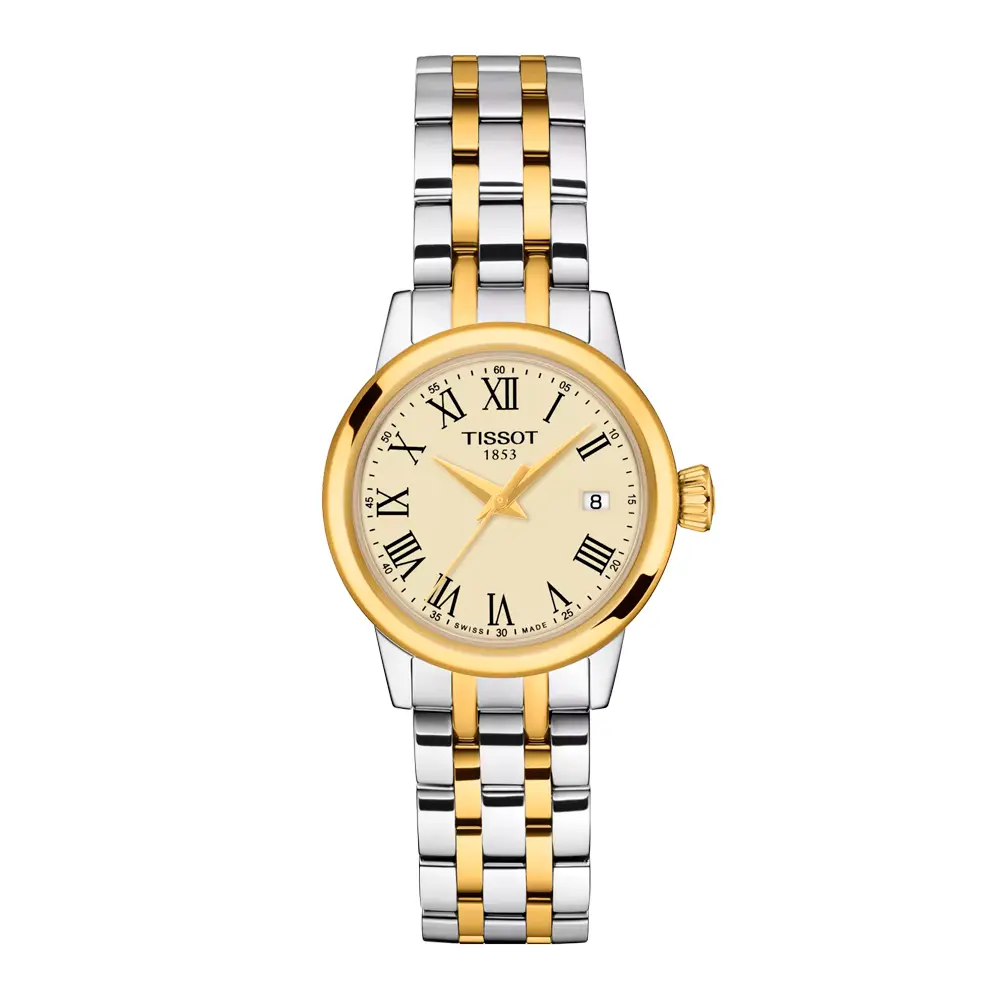 The Tissot Classic Dream Lady T129.210.22.263.00 embodies timeless elegance and refined femininity, enhanced by Swiss precision and craftsmanship. Its 28mm stainless-steel 316L case with two-tone yellow gold PVD coating offers a luxurious yet subtle look.