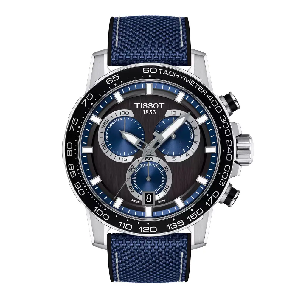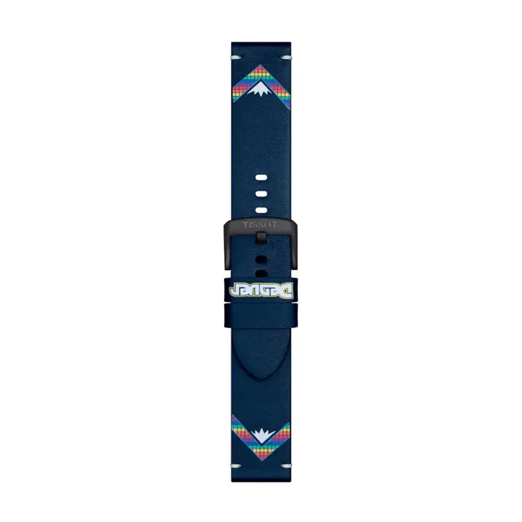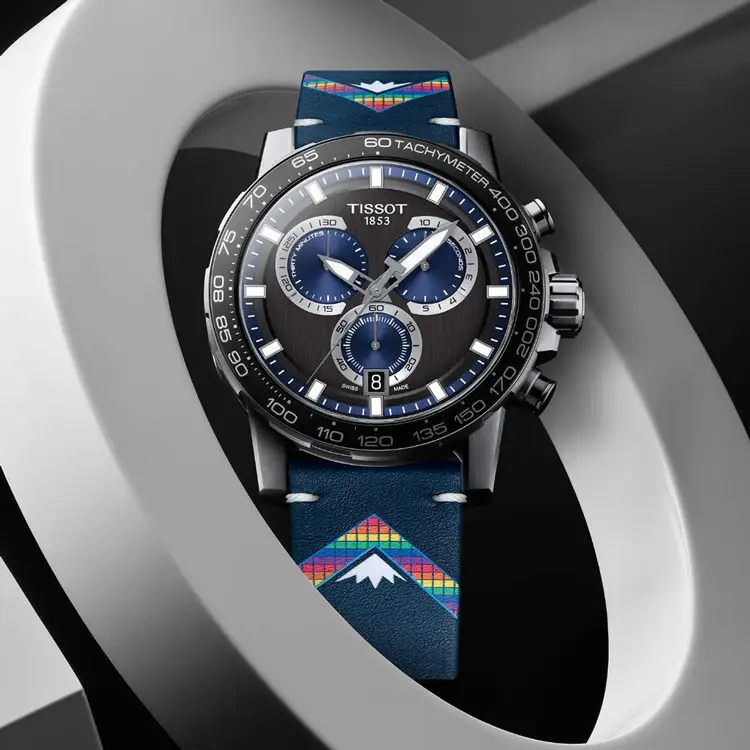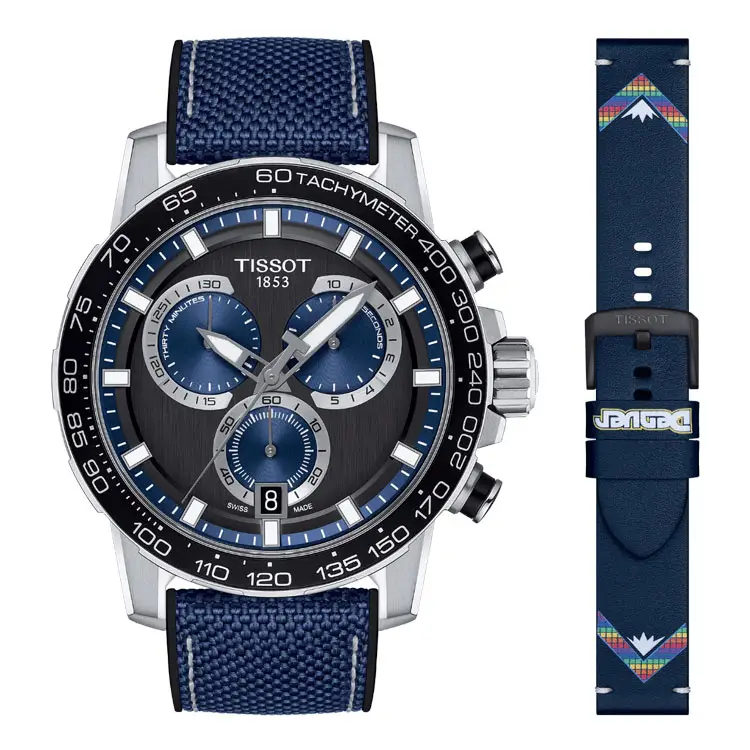 The Tissot Supersport Chrono Denver Nuggets 2023 NBA Champions is a limited edition sports watch celebrating the team's historic NBA victory. It features a bold 45.5 mm stainless steel case, a black dial with contrasting subdials, and a blue textile strap with rubber lining in team colors. The case back is engraved with the Denver Nuggets logo and “2023 NBA Champions”.