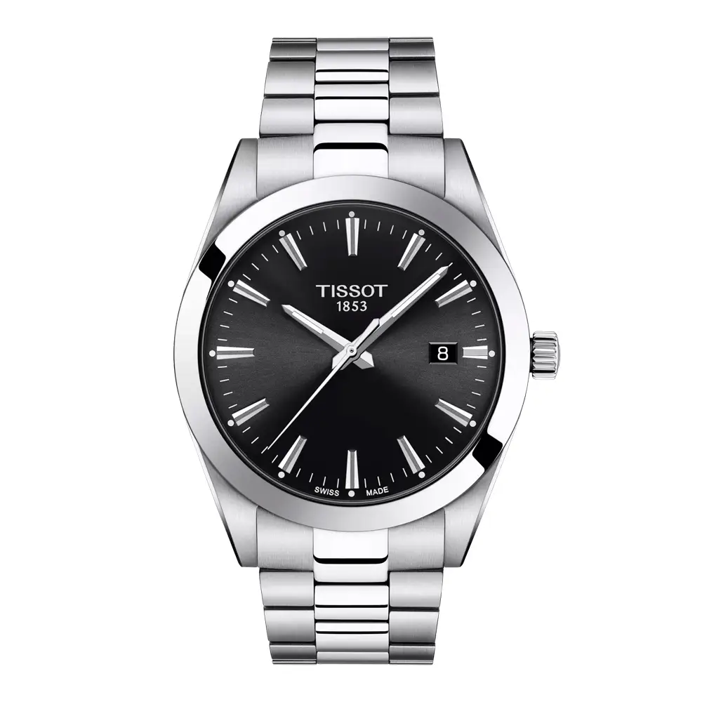 Tissot Gentleman T127.410.11.051.00 combines classic elegance, modern functionality, and Swiss precision. Its 40 mm stainless-steel case is paired with a black dial featuring polished indexes and hands, emphasizing the watch’s timeless character. A date window at 3 o’clock adds a practical touch for everyday wear.