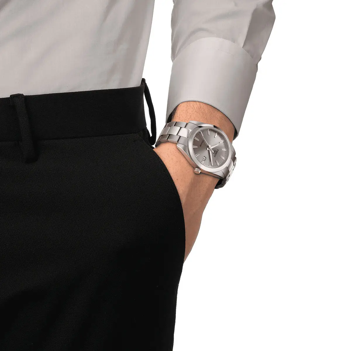 Tissot Gentleman Titanium T127.410.44.081.00 combines lightweight titanium, durability, and elegant design in perfect harmony. Its 40 mm titanium case is exceptionally light, strong, and hypoallergenic, ensuring maximum comfort on the wrist. The matte grey textured dial with polished indexes and luminous hands offers excellent legibility both day and night.