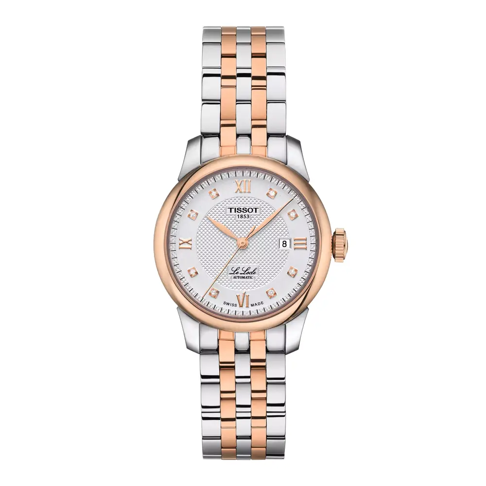 The Tissot Le Locle Automatic Lady T006.207.22.036.00 blends traditional Swiss watchmaking with elegant aesthetics, appealing to women with refined taste. Its 316L stainless-steel case with a rose-gold PVD finish and 29 mm diameter create a noble and delicately feminine look. The silver dial with Roman numerals and eight diamonds enhances the watch’s timeless luxury and adds a touch of exceptional elegance.