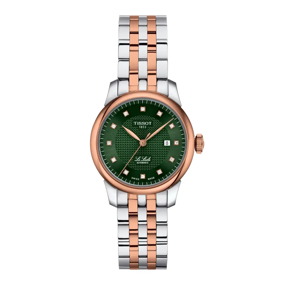 The Tissot Le Locle Automatic Lady T006.207.22.096.00 embodies refined Swiss watchmaking tradition in an elegant ladies’ design. The green sunray dial brings a modern and sophisticated touch, while the classic Roman numerals and slender hands preserve the timeless character of the Le Locle collection.