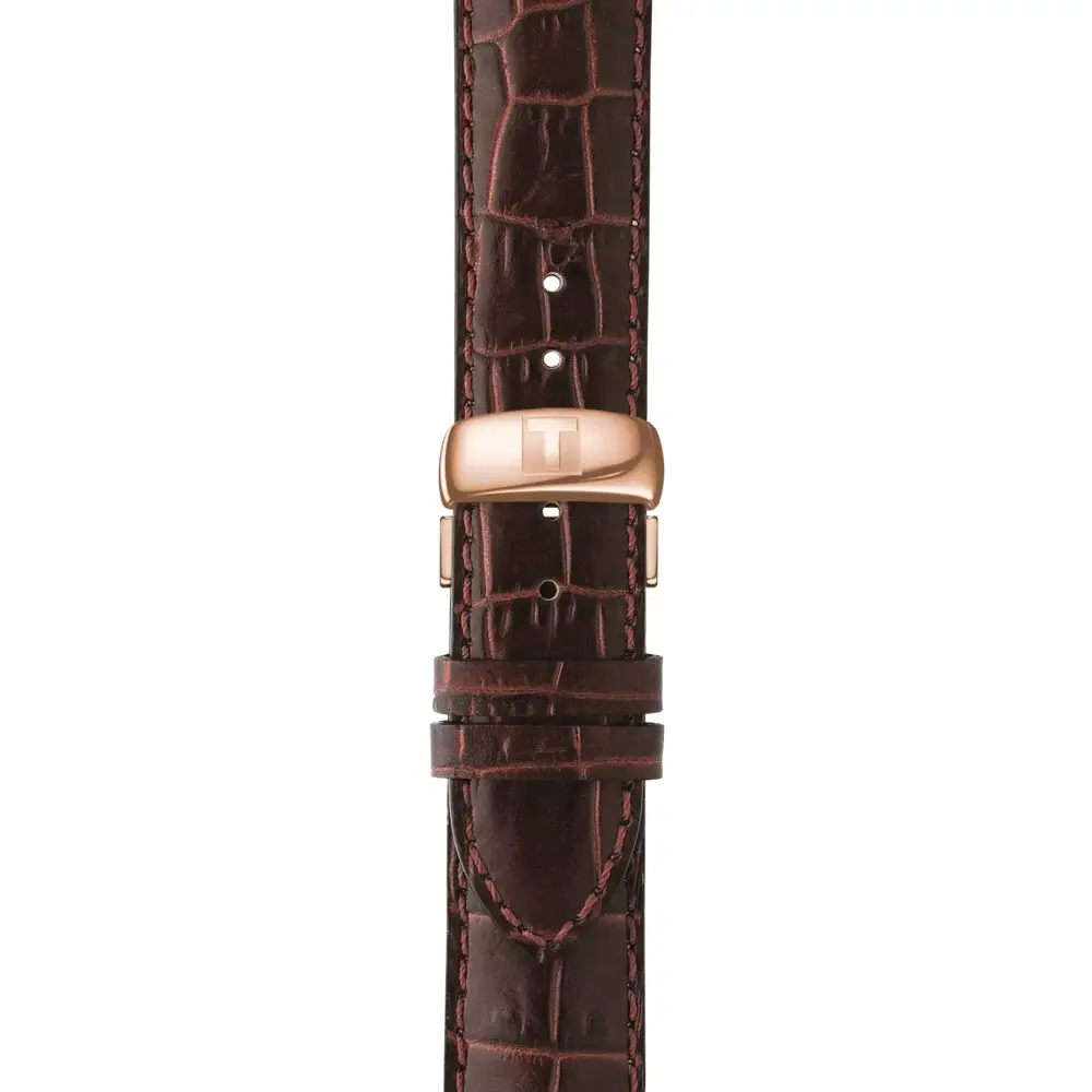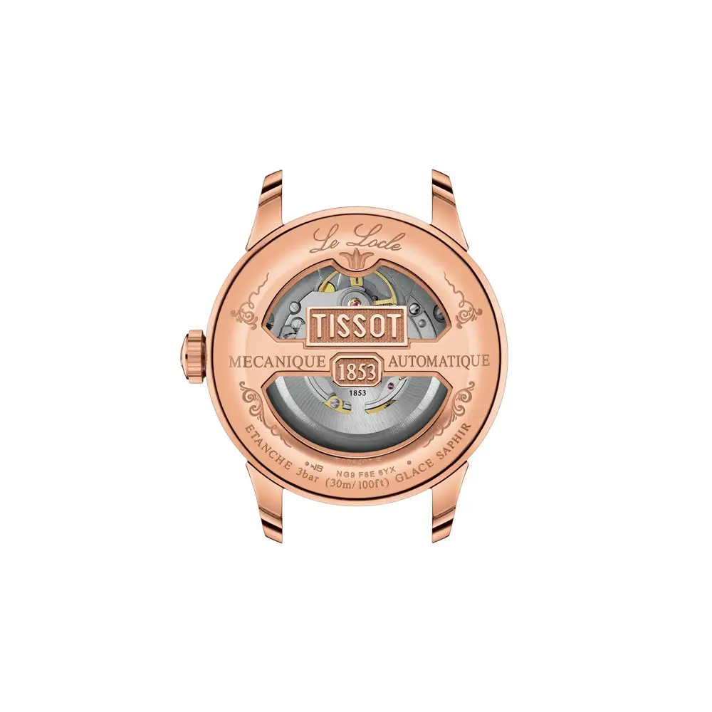 The Tissot Le Locle Powermatic 80 T006.407.36.033.00 represents true classicism and the precision of Swiss watchmaking. Its 316L stainless-steel case with a rose-gold PVD finish and a 39.3 mm diameter give the watch a refined yet confident elegance on the wrist. The silver dial features Roman numerals, a delicate guilloché pattern, and a date display, emphasizing the model’s formal and timeless aesthetic.