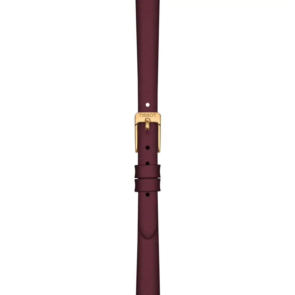 The highlight is a burgundy dial combined with fine gold-tone hands and indices, enhancing its feminine and elegant character. Thanks to its compact size, the watch feels like a stylish piece of jewelry on the wrist. It is fitted with a leather strap in a matching tone, ensuring comfort and a harmonious look.