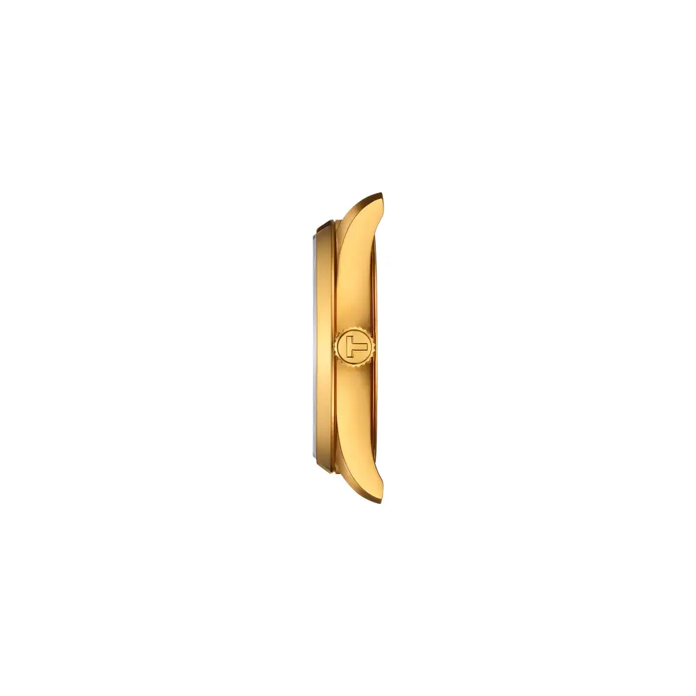 The Tissot PR 100 34mm T150.210.33.021.00 is an elegant yet durable model that combines Swiss precision with timeless style. The round 34 mm case is crafted from stainless steel with yellow gold PVD coating, giving the watch a luxurious appearance and ensuring long-lasting durability. The dial is protected by a sapphire crystal, highly resistant to scratches.