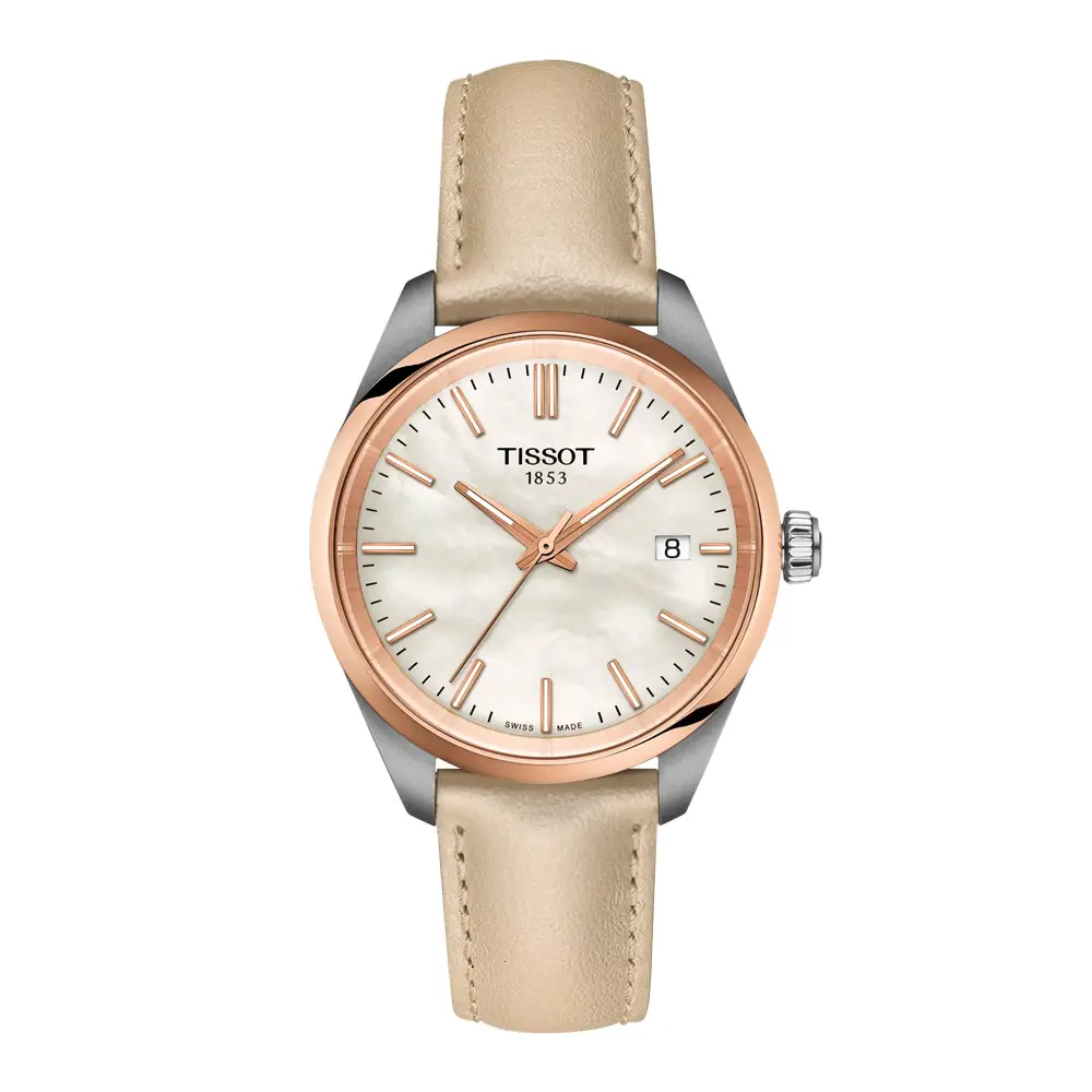 The Tissot PR 100 ladies’ watch impresses with an elegant and timeless design, ideal for everyday wear as well as formal occasions. The 34 mm case diameter offers a refined, balanced presence on the wrist, while the mother-of-pearl dial adds a sophisticated and feminine touch. Thanks to the natural structure of mother-of-pearl, each dial is visually unique.
