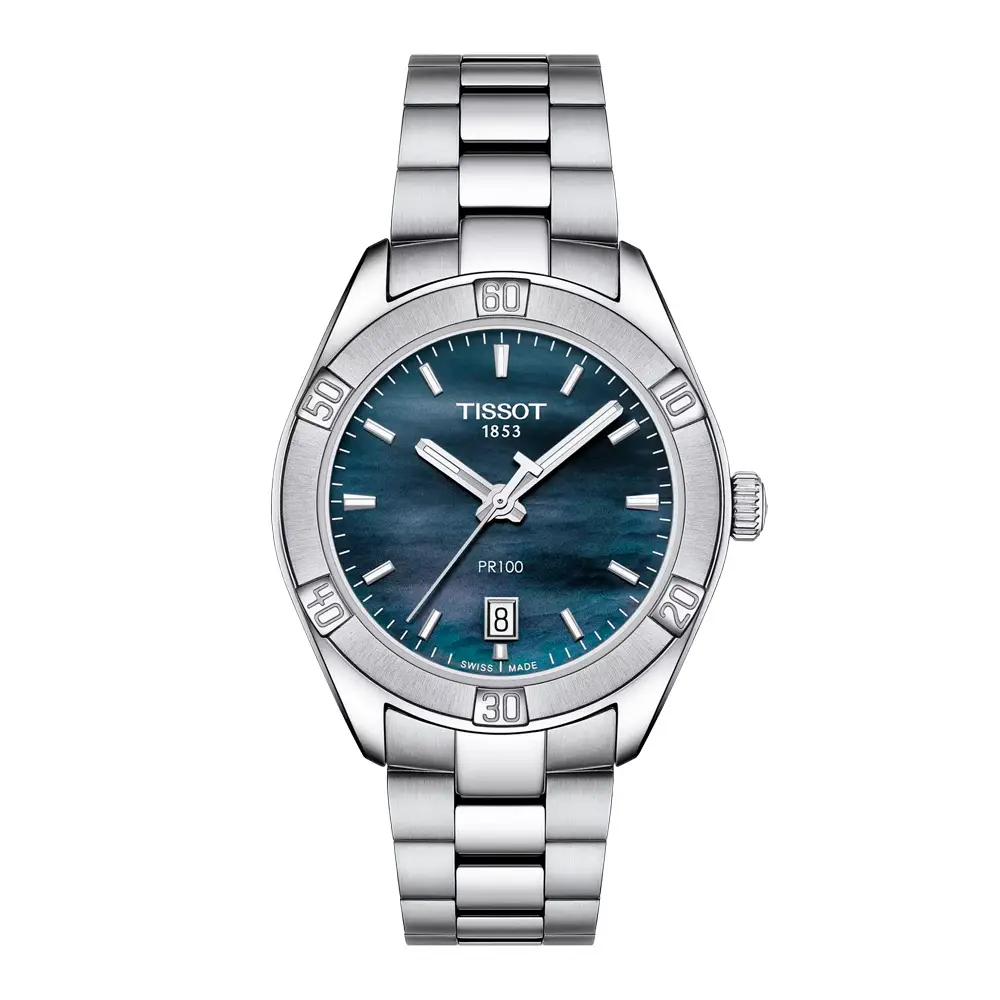 The Tissot PR 100 Sport Chic T101.910.11.121.00 perfectly blends modern elegance with timeless Tissot design. Its 36mm stainless-steel 316L case is paired with a luminous mother-of-pearl dial, offering a refined and feminine touch suitable for any occasion.