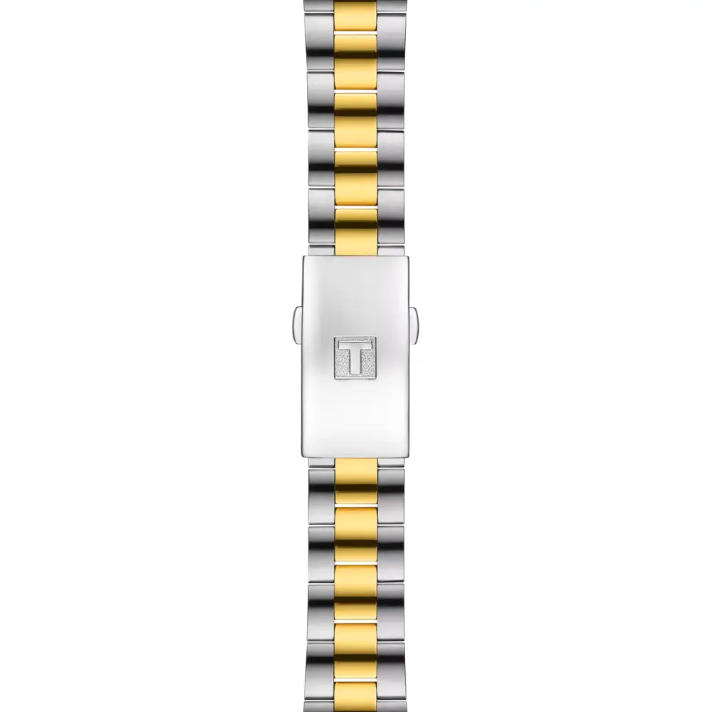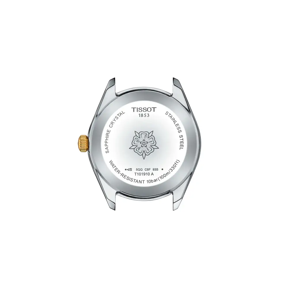The Tissot PR 100 Sport Chic T101.910.22.111.00 is a stylish ladies’ model that perfectly combines sporty dynamism with elegant design. The 36 mm round stainless steel case with a yellow gold PVD bezel is protected by a durable sapphire crystal for maximum scratch resistance. The delicate mother-of-pearl dial features gold accents and a practical date display at 3 o’clock.