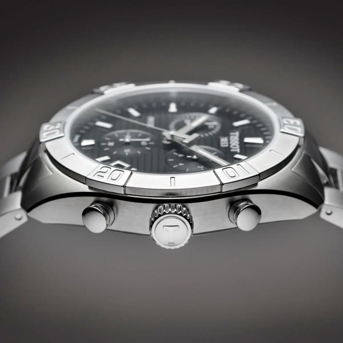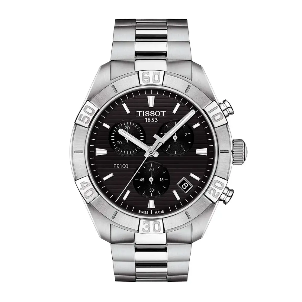 Tissot PR 100 Sport Gent Chronograph T101.617.11.051.00 combines sporty elegance, performance, and Swiss precision. Its 44 mm stainless-steel case is paired with a black dial featuring three chronograph subdials, contrasting hands, and indexes, ensuring excellent readability in any light conditions.