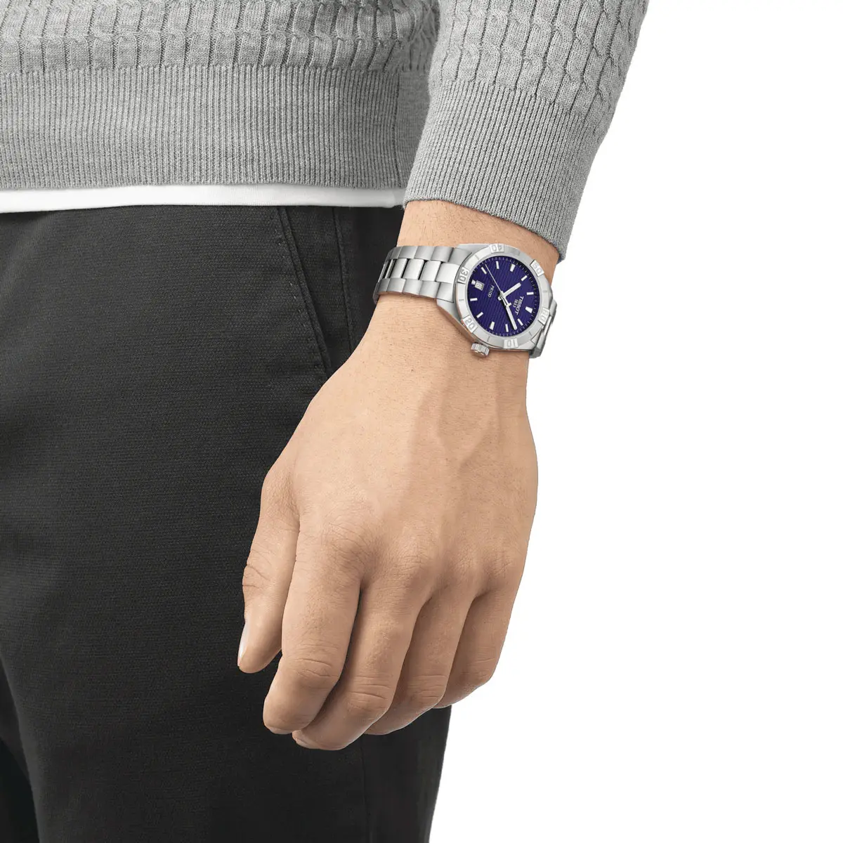 Tissot PR 100 Sport Gent T101.610.11.041.00 combines sporty elegance, modern design, and Swiss precision. Its 42 mm stainless-steel case is complemented by a sunray blue dial with polished indexes and luminous hands, ensuring perfect readability in all conditions.