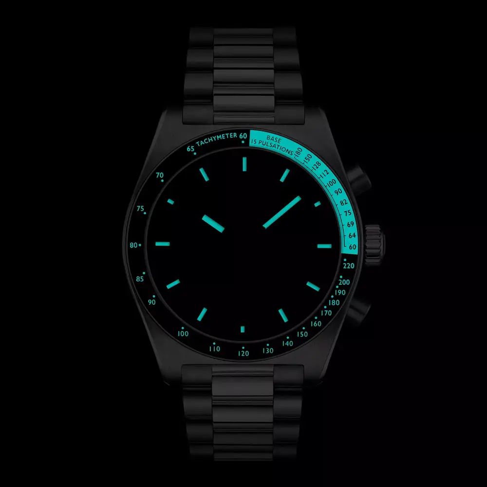 The 40 mm case is made of 316L stainless steel and equipped with a scratch-resistant sapphire crystal with anti-reflective coating. The model features a tachymeter scale for speed calculations and 100 m (10 ATM) water resistance, suitable for swimming and everyday contact with water. A stainless-steel bracelet with butterfly clasp offers comfort and secure wrist presence.