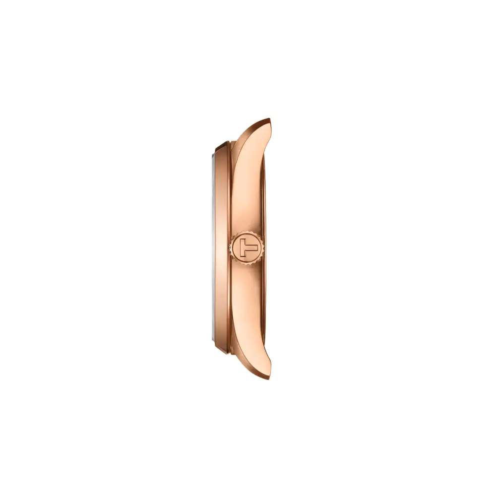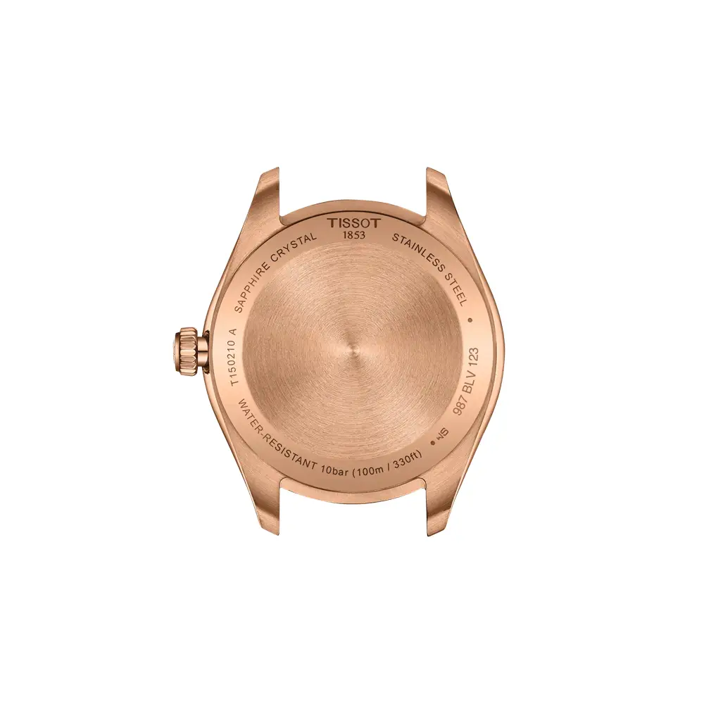 The Tissot PR 100 Lady features a 34 mm stainless-steel case with a rose-gold PVD coating, offering a modern and elegant take on a classic ladies' timepiece. The sapphire crystal, 316L steel construction and 100 m (10 bar) water resistance ensure durability, making the watch suitable for everyday wear as well as a more active lifestyle.