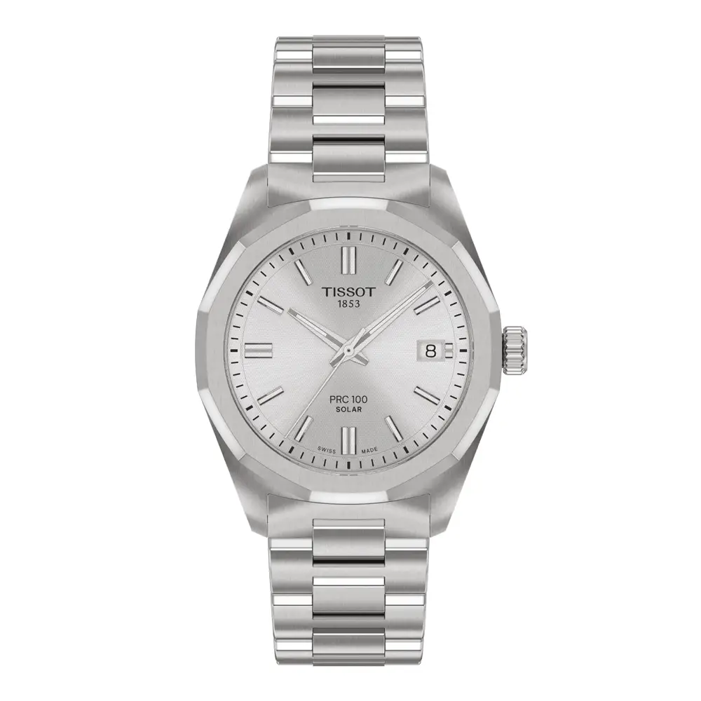 The Tissot PRC 100 Solar in a compact 34 mm size offers a modern, clean design paired with impressive durability. Its 316L stainless-steel case, sapphire crystal and 100 m (10 bar) water resistance make it a reliable companion for both everyday wear and more active moments. The stainless-steel bracelet with butterfly clasp and quick-release system ensures comfort and versatility.