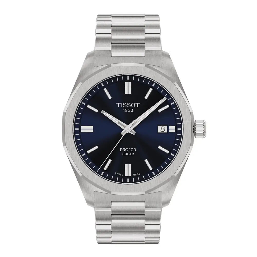 Additional functionality includes water resistance up to 100 meters (10 bar), a stainless steel bracelet with quick-release system, and a butterfly clasp with push-buttons. The Tissot PRC 100 Solar is a perfect choice for men seeking an elegant watch with modern technology and everyday comfort.