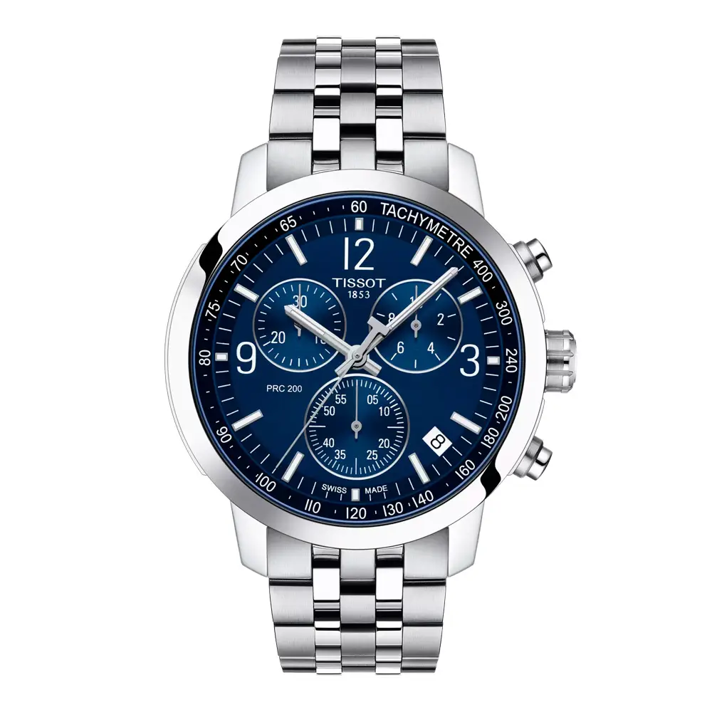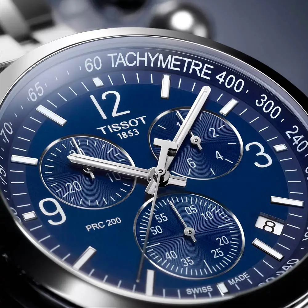 Tissot PRC 200 Chronograph T114.417.11.047.00 combines sporty elegance, performance, and Swiss precision. Its 43 mm stainless-steel case frames a blue dial with three chronograph subdials, luminous hands and indexes, ensuring perfect readability even in low light conditions.