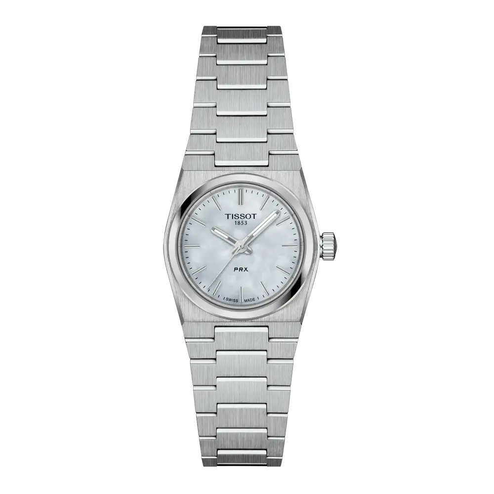 The Tissot PRX 25mm (T137.010.11.111.00) brings elegant, contemporary design inspired by iconic models from the 1970s. Its compact 25 mm 316L stainless-steel case is paired with an integrated steel bracelet, creating a perfectly smooth silhouette on the wrist. The luxurious feel is enhanced by the mother-of-pearl dial, which reveals beautiful light reflections as it moves.