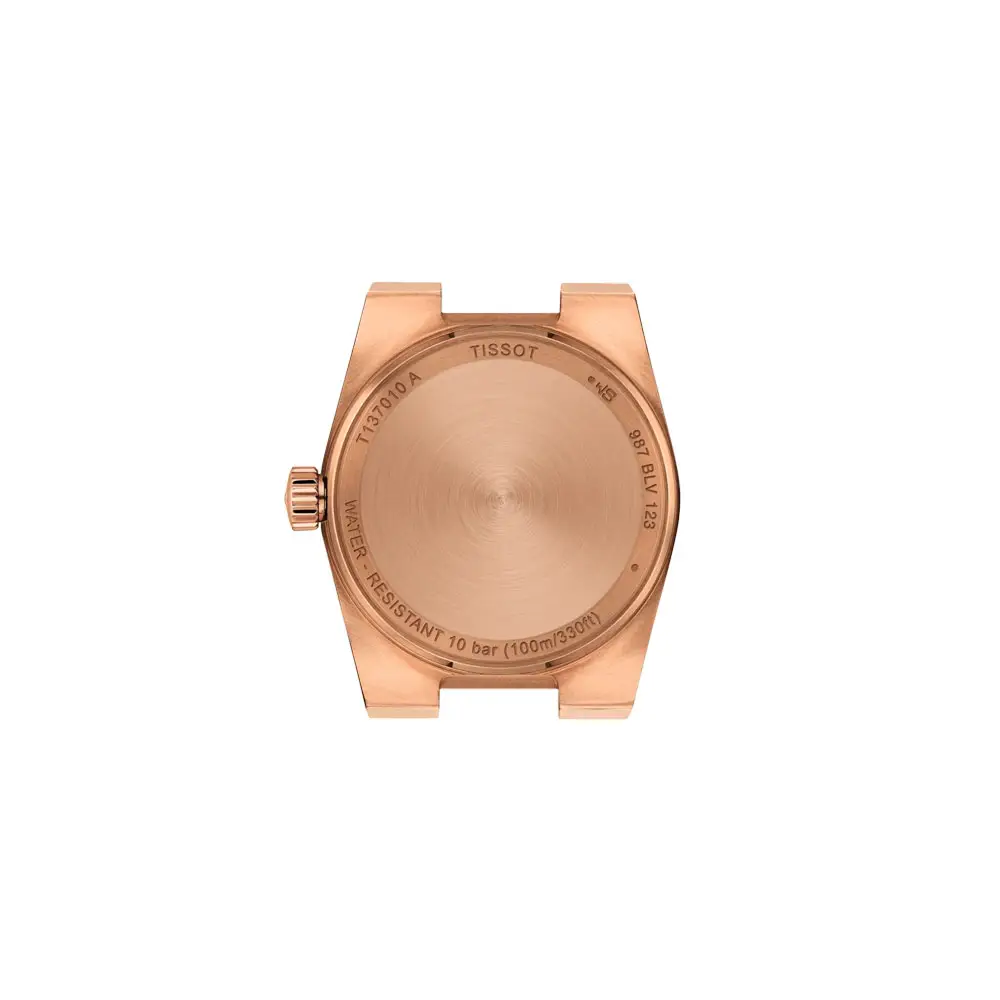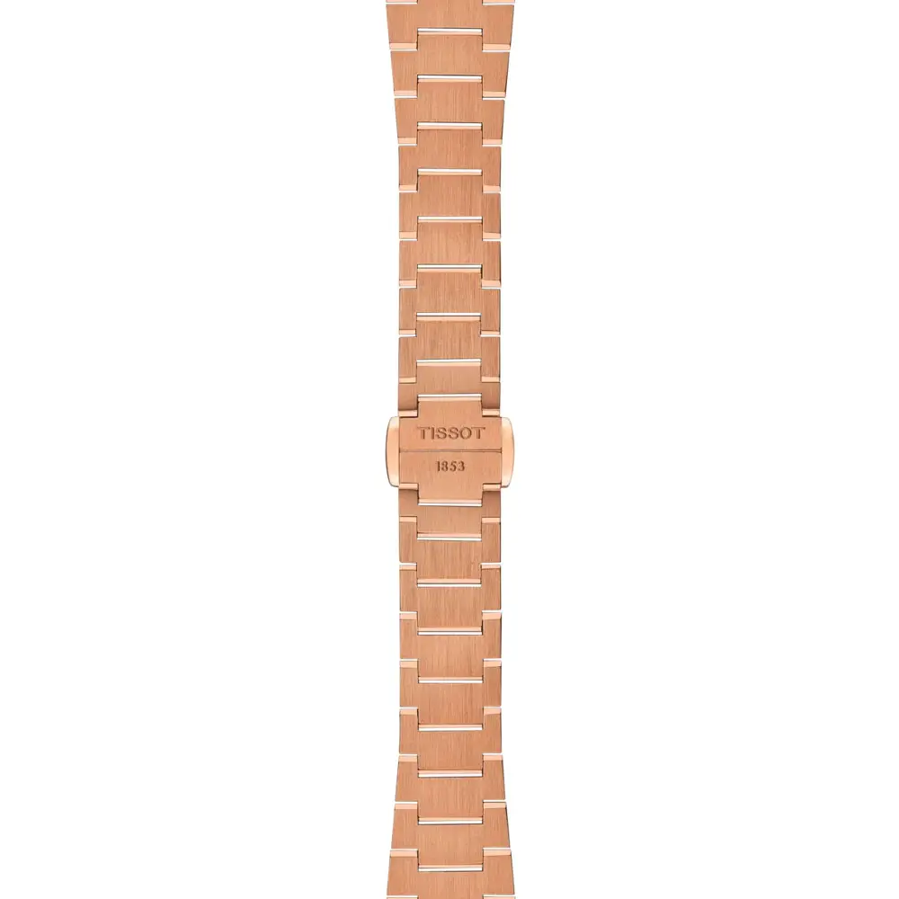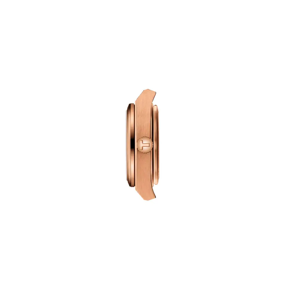 The Tissot PRX 25mm T137.010.33.506.00 brings the iconic 1970s design into a modern feminine form. Its 25mm stainless-steel 316L case with rose-gold PVD coating is paired with a sunray brown dial, radiating warmth and sophistication.