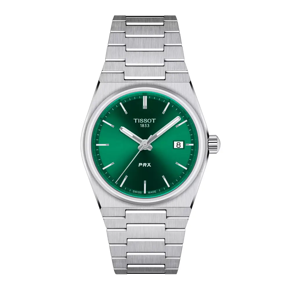 The Tissot PRX 35mm, model T137.210.11.081.00, is an elegant watch that combines retro style with modern technology. This model features a 35 mm case diameter, made of stainless steel, and a green sunburst dial. The watch has an integrated stainless steel bracelet with a quick-release system, making it easy to change straps.