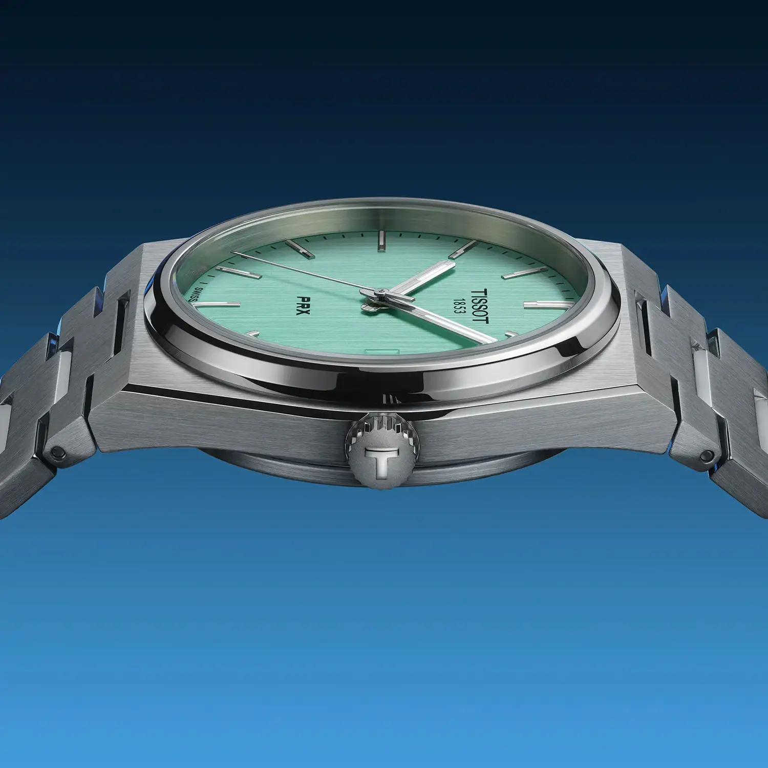 The Tissot PRX 35 mm T137.210.11.091.00 revives an icon from 1978, blending vintage charm with modern Swiss precision. Its 35 mm integrated 316L stainless steel case delivers a refined, timeless look, while the green sunburst dial plays beautifully with the light to create dynamic depth and elegance.