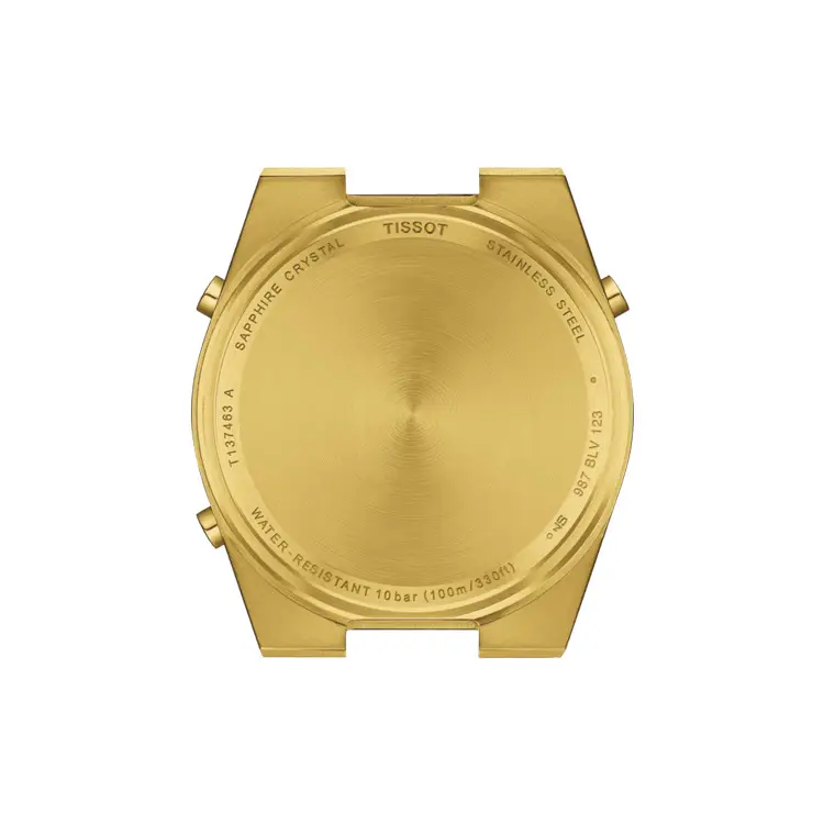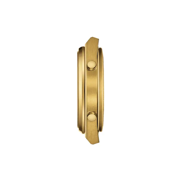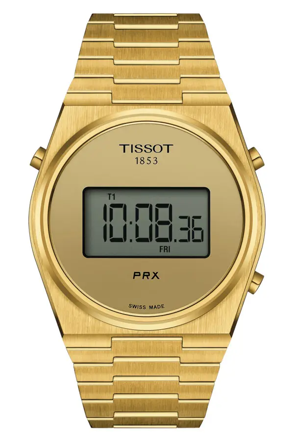 The PRX Digital is water-resistant up to 100 meters (10 bars), making it suitable for swimming and other water activities. The watch has a gold-colored stainless steel bracelet with a quick-release system and a butterfly clasp with buttons, ensuring comfortable wear and easy bracelet replacement.