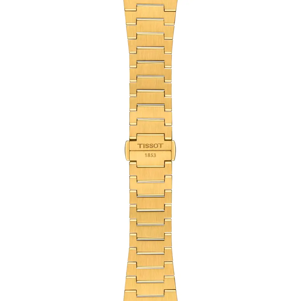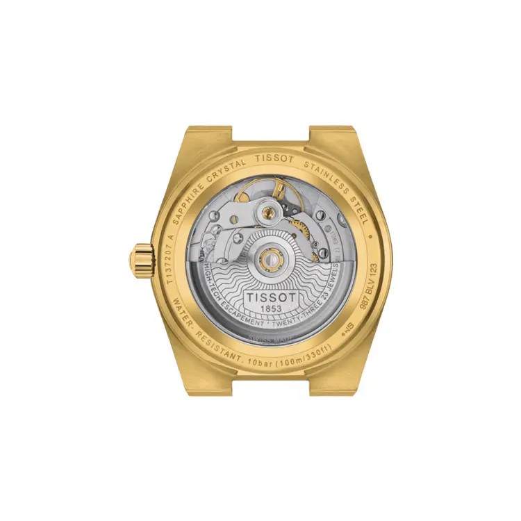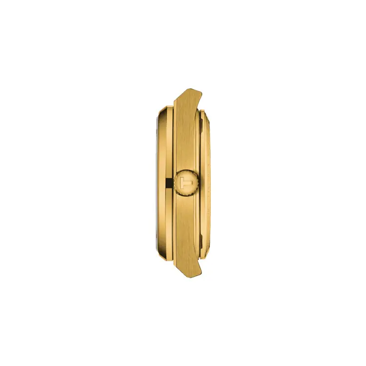The Tissot PRX Powermatic 80 35mm T137.207.33.021.00 combines modern elegance with the precision of Swiss watchmaking. The 35 mm round stainless steel case with yellow gold plating is protected by a durable sapphire crystal, beneath which lies a gold-toned textured dial. A practical date display at 3 o’clock enhances the model’s functionality.