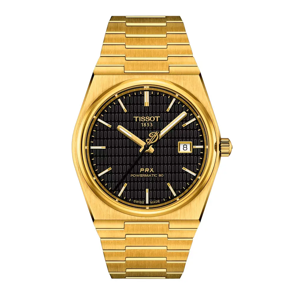 The Tissot PRX Powermatic 80 Damian Lillard Special Edition T137.407.33.051.00 is a unique limited-edition model that combines the elegance of the legendary PRX line with the distinctive style of basketball star Damian Lillard. The 40 mm round stainless steel case with yellow gold PVD is protected by a durable sapphire crystal, beneath which lies a black dial with subtle details inspired by the player’s career and a date window at 3 o’clock.