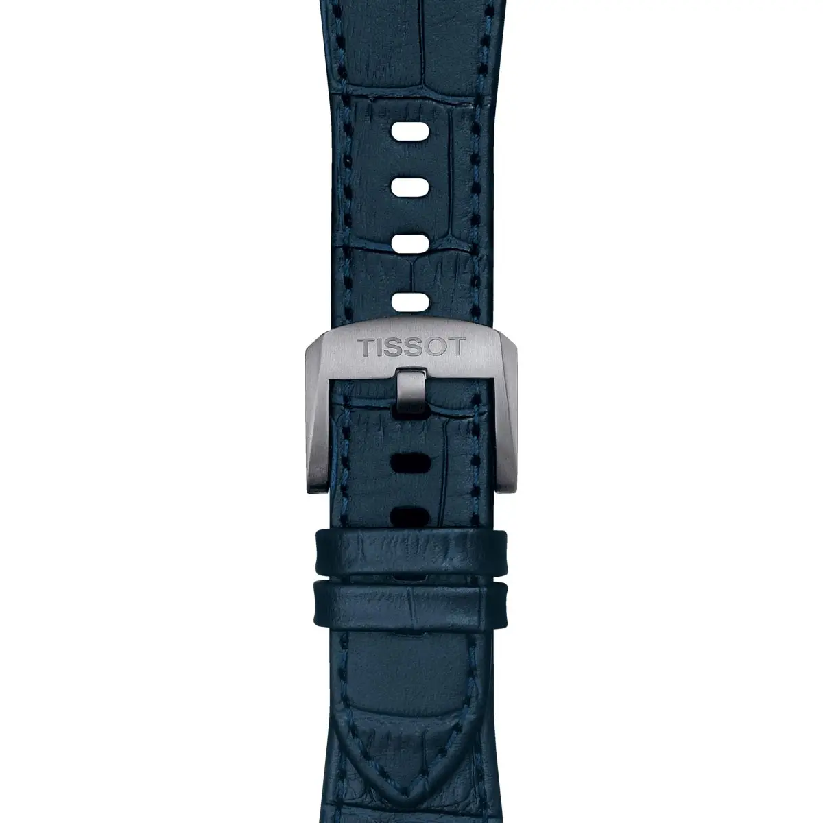 The Tissot PRX Powermatic 80 40mm with a blue dial and leather strap is a symbol of modern style and precise Swiss watchmaking tradition. The watch features a 40 mm round stainless steel case, protected by a highly durable sapphire crystal that ensures perfect readability and scratch resistance.