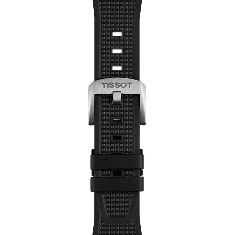 The black rubber strap (21 mm wide) is secured with a classic pin buckle, providing both comfort and safety.