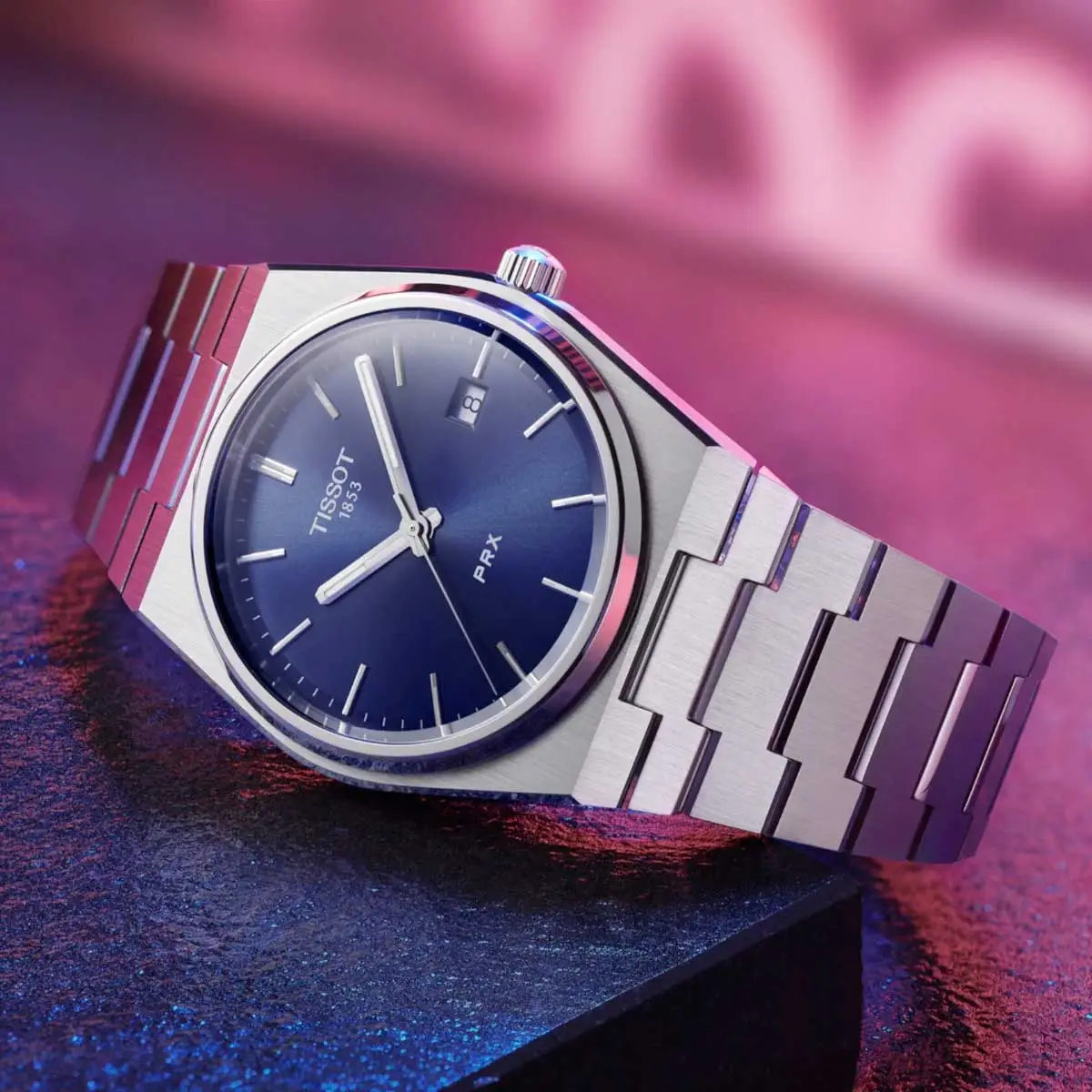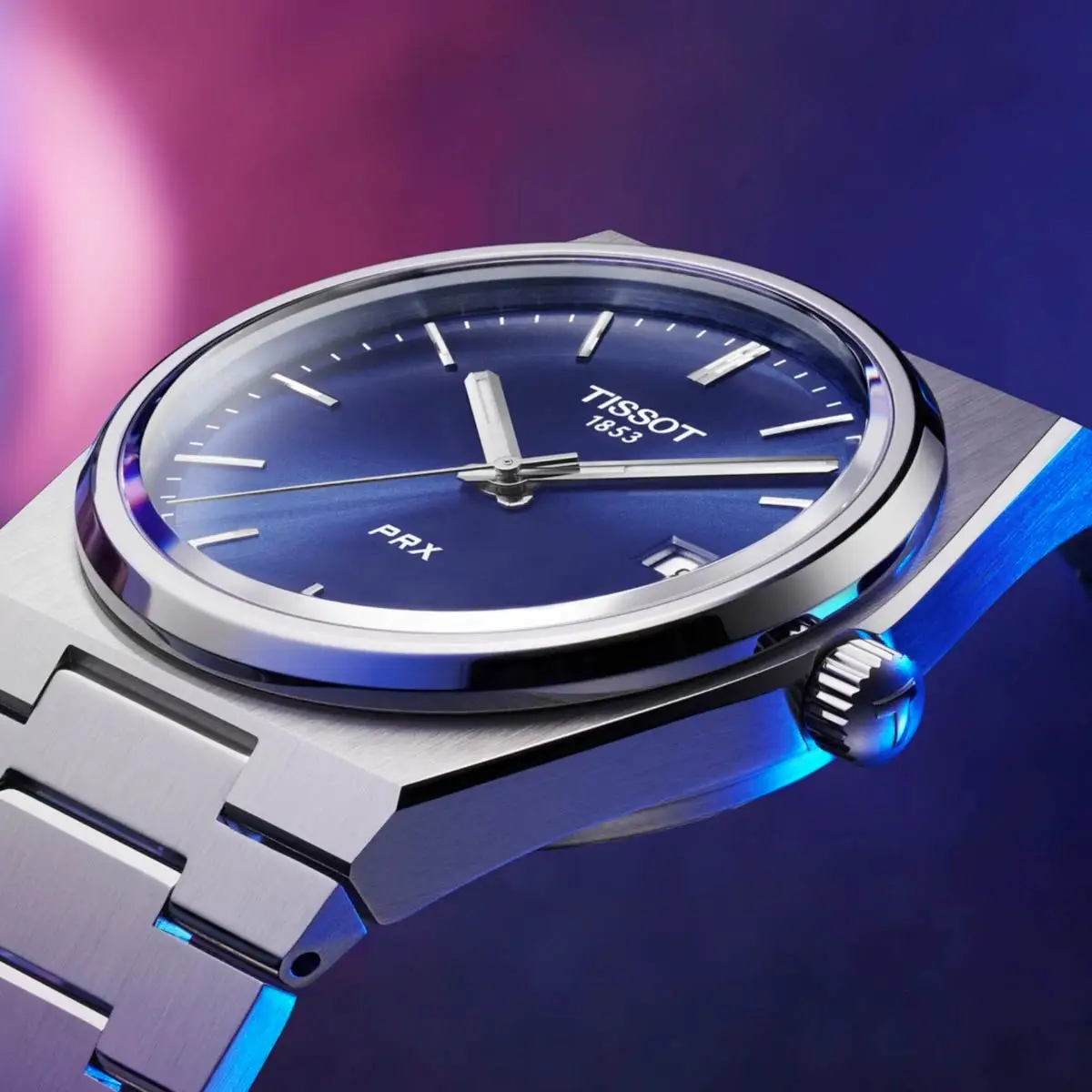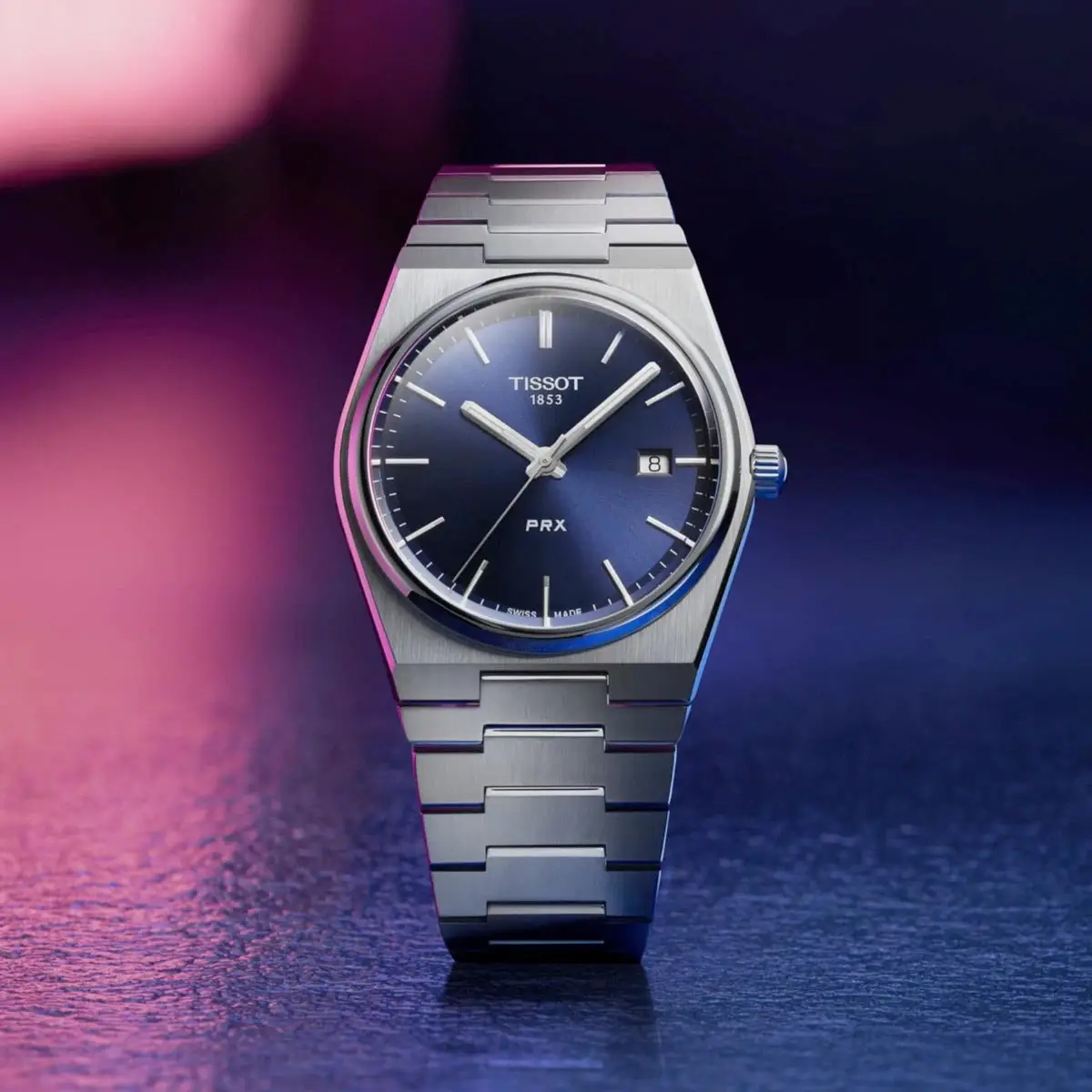 Tissot PRX T137.410.11.041.00 combines retro 1970s style with modern Swiss precision. Its 40 mm stainless-steel case with an integrated bracelet offers both elegance and sporty appeal. The blue vertically brushed dial features polished indexes and luminous hands, while the sapphire crystal with anti-reflective coating ensures durability and excellent readability.