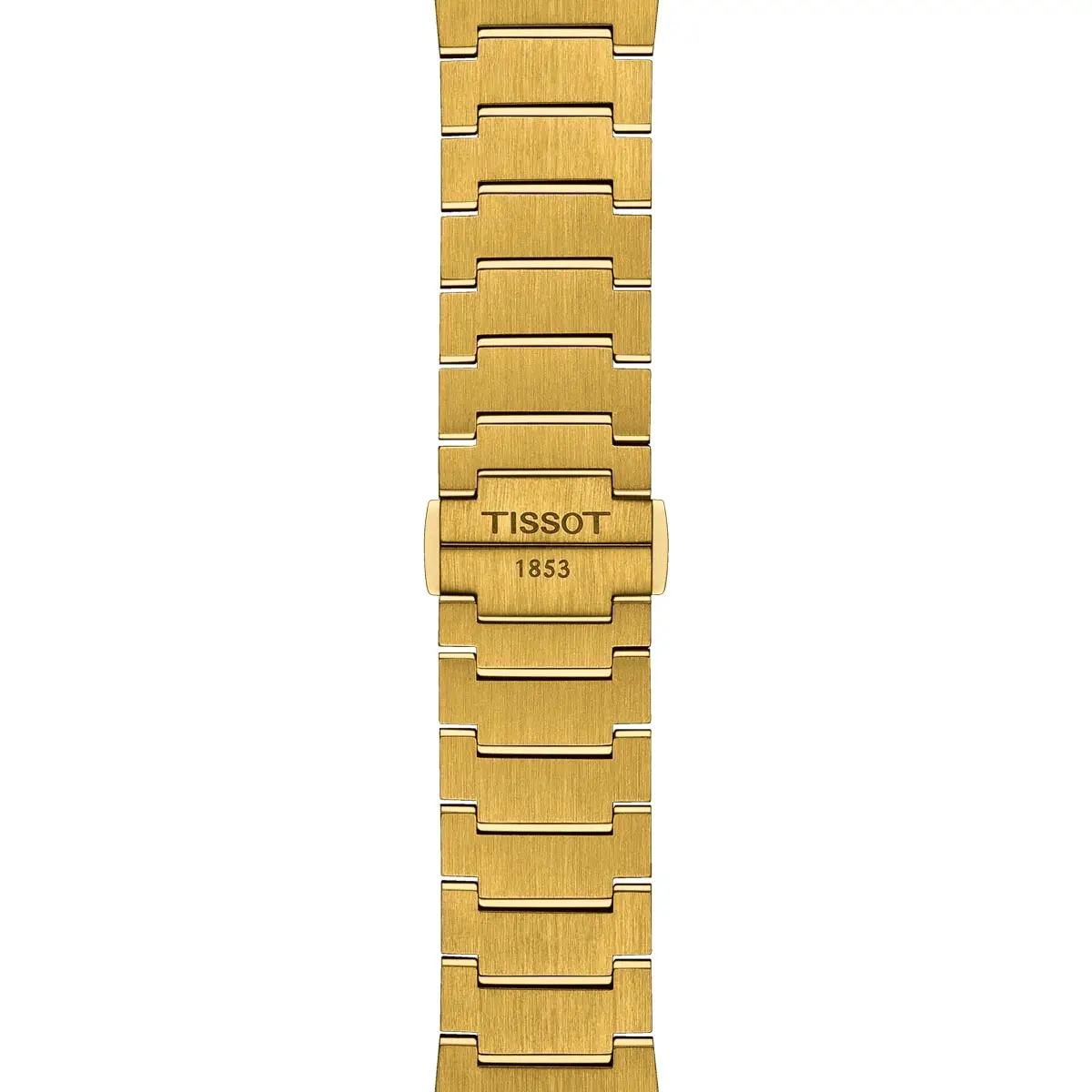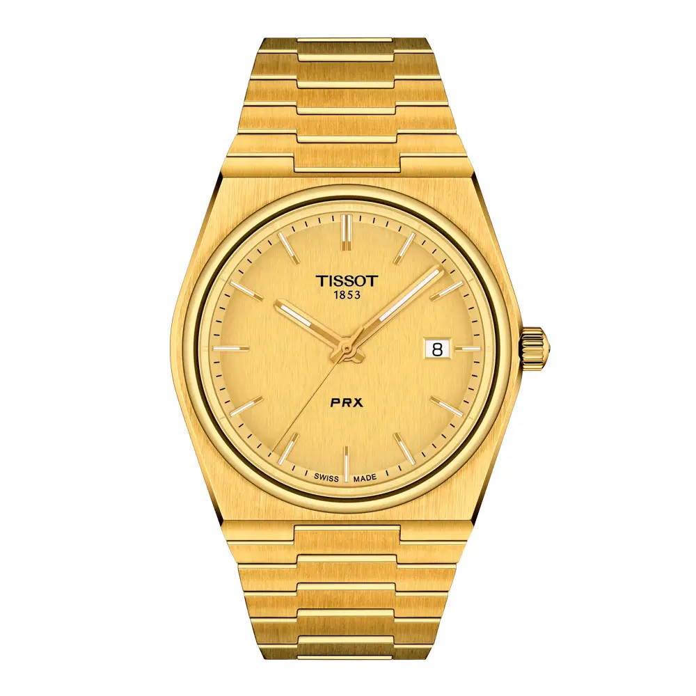 The Tissot PRX Quartz 40mm in a luxurious gold design represents the perfect blend of timeless elegance and modern functionality. The watch features a 40 mm round stainless steel case with yellow gold PVD coating, protected by a highly durable sapphire crystal that provides excellent scratch resistance.