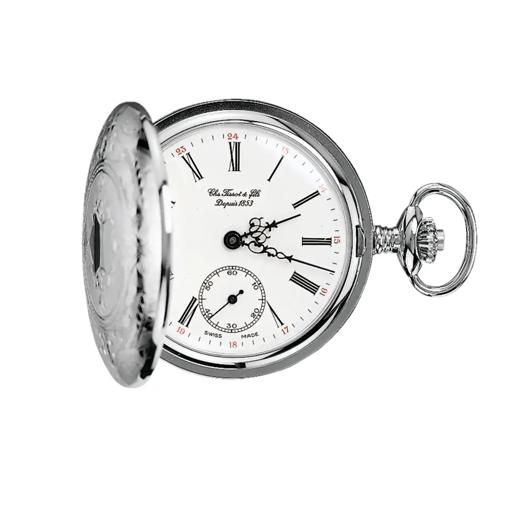 The Tissot Savonnette T83.6.401.13 reflects the heritage of classic pocket watches with a clean and elegant expression of Swiss craftsmanship. Its 316L stainless-steel case with a palladium finish and 49.6 mm diameter give the watch a refined and distinguished presence. The white dial with Roman numerals reinforces its timeless, historical character.