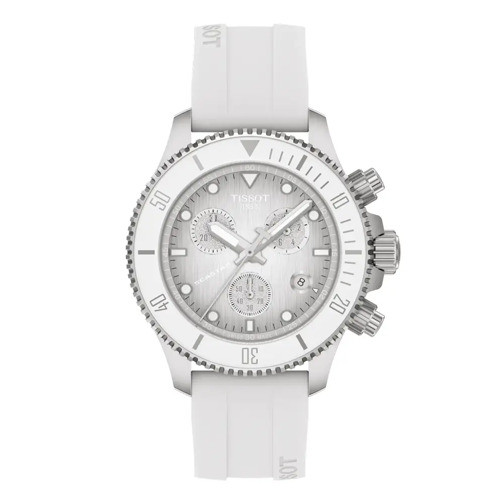 The Tissot Seastar 1000 Chronograph T120.217.17.011.00 is a sporty women’s timepiece that fuses professional diving performance, modern aesthetics and Swiss precision. Its compact 38 mm 316L stainless-steel case is paired with a clean white silicone strap, making the watch lightweight, comfortable and perfectly suited for an active lifestyle. The combination of sporty energy and elegant details makes this model a striking companion for everyday wear.