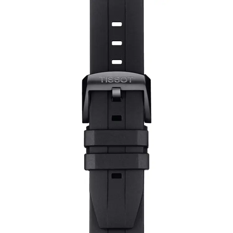 The watch is paired with a black rubber strap featuring a folding clasp and diver extension. The Tissot Seastar 1000 Chronograph is perfect for those seeking professional-grade features, Swiss precision, and bold design.