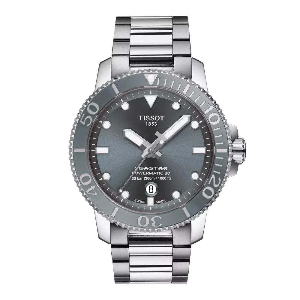 Tissot Seastar 1000 Powermatic 80 T120.407.11.081.01 unites sporty elegance, performance, and Swiss precision. Its 43 mm stainless-steel case is paired with a grey gradient sunburst dial, featuring luminous hands and indexes for perfect underwater legibility. The ceramic unidirectional bezel and screw-down crown highlight its professional diving spirit.