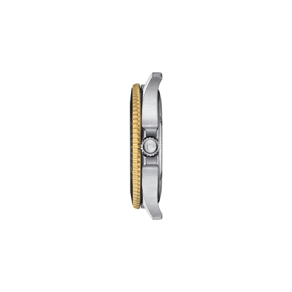 The Tissot Seastar 1000 Quartz is an iconic diving watch that combines professional performance with elegant sport design. The 40 mm case diameter offers a robust yet balanced presence on the wrist. The black dial with bold indexes and hands ensures excellent readability, while the two-tone steel and gold PVD finish adds a refined luxury touch.
