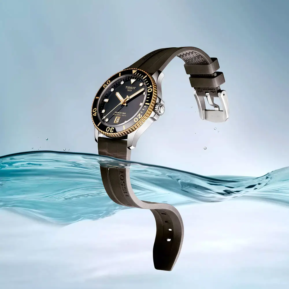 The 40 mm case is made from 316L stainless steel with yellow-gold PVD accents, offering premium aesthetics and enhanced durability. A sapphire crystal with anti-reflective coating minimizes glare, while 300 m (30 ATM) water resistance and a screw-down crown confirm the watch’s capability for demanding water activities. The sporty black rubber strap ensures both comfort and secure wrist fit.