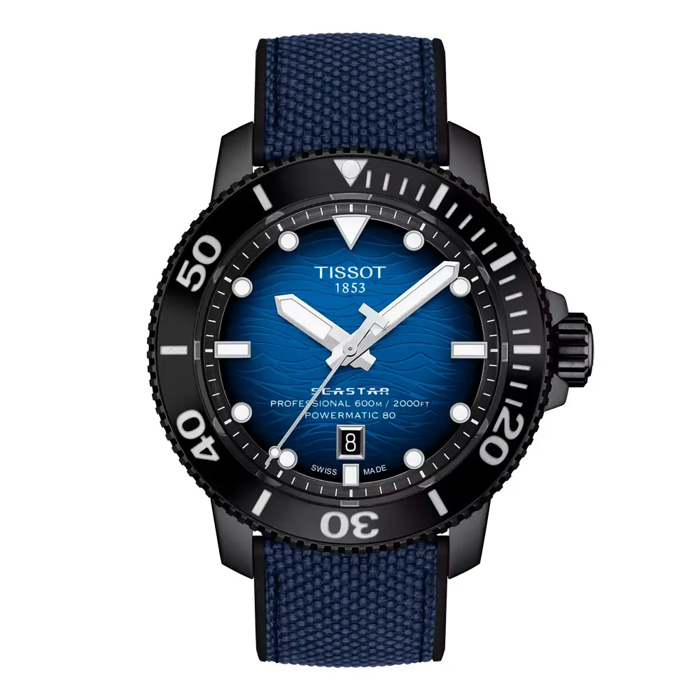 Tissot Seastar 2000 Professional Automatic T120.607.37.041.00 combines professional performance, modern design, and Swiss precision. Its 46 mm stainless-steel case with black PVD coating is paired with a blue gradient dial with wave pattern, featuring luminous hands and indexes for perfect underwater visibility. The ceramic unidirectional bezel and screw-down crown highlight its true diver’s spirit.