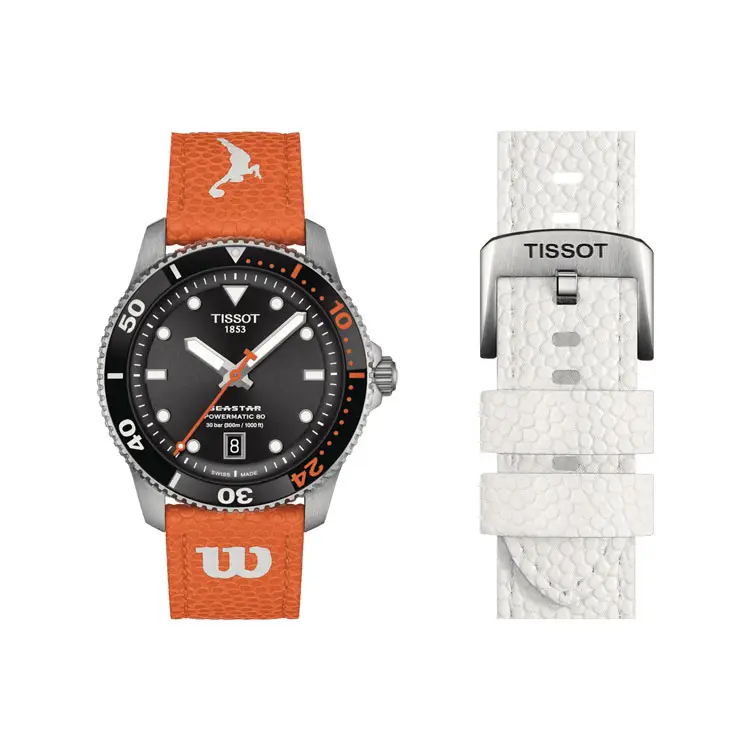 The Tissot Seastar Wilson WNBA T120.807.17.051.00 is a sporty yet elegant diver’s watch inspired by the energy of women’s basketball. The 40 mm round stainless steel case is fitted with a ceramic bezel and protected by a scratch-resistant sapphire crystal. The black dial with bold luminescent elements features a date display at 6 o’clock.