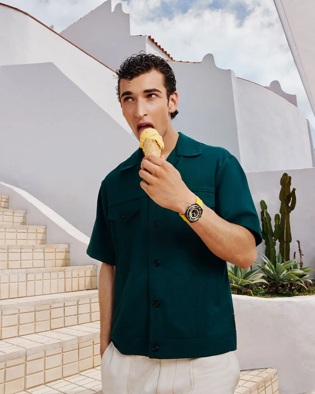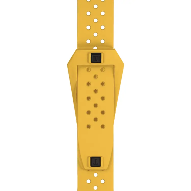 The watch is water-resistant up to 300 meters (30 bar), making it ideal for water sports enthusiasts. The unique perforated rubber strap in bright yellow adds to the watch's attractiveness and comfort when wearing. Moreover, the watch has an innovative clasp system without a traditional buckle, ensuring secure and comfortable attachment to the wrist.